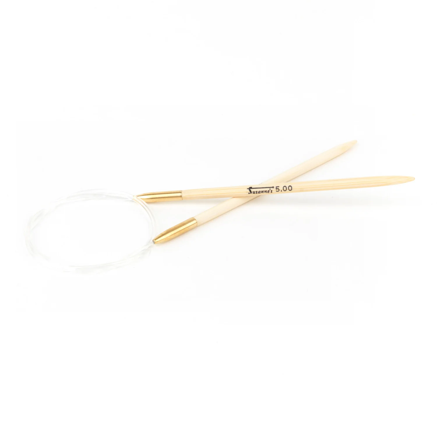 Agujas circulares de bambú para tejer de 80 cm. Son dos agujas cortas unidas por un cable o tanza. Se pueden utilizar para tejidos planos (cuando se teje ida y vuelta girando la labor entre hileras) para crear proyectos como chaquetas, mantitas etc y para tejidos circulares (uniendo el comienzo con el final tejiendo en círculo) para realizar gorros, sweaters… Tienen 3 ventajas principales: al tejer en círculos se crea un tejido tubular sin costuras, tejiendo en plano se pueden realizar proyectos bastantes grandes, colocando los puntos en el cable y las agujas y, además, el peso del tejido en ambas técnicas yace sobre el cable y no sobre las agujas que sólo cargan con una parte del tejido a medida que se van deslizando los puntos de una aguja a otra.