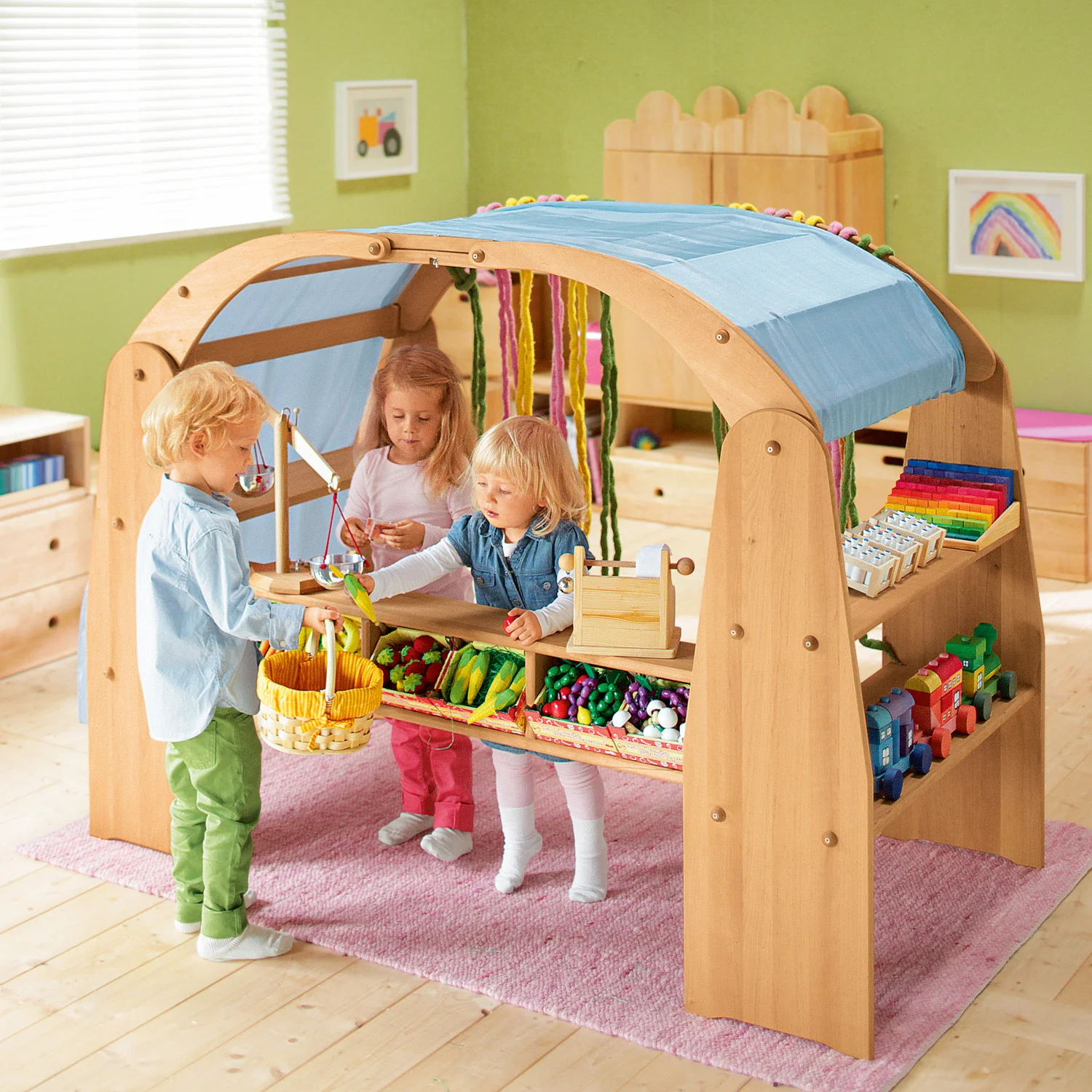 La casa de juegos Mia está compuesta por dos robustos arcos de madera maciza de aliso biológica que hacen de techo. La casita puede convertirse en una frutería, un supermercado,… Perfecta para que los niños disfruten de una tarde de juegos.