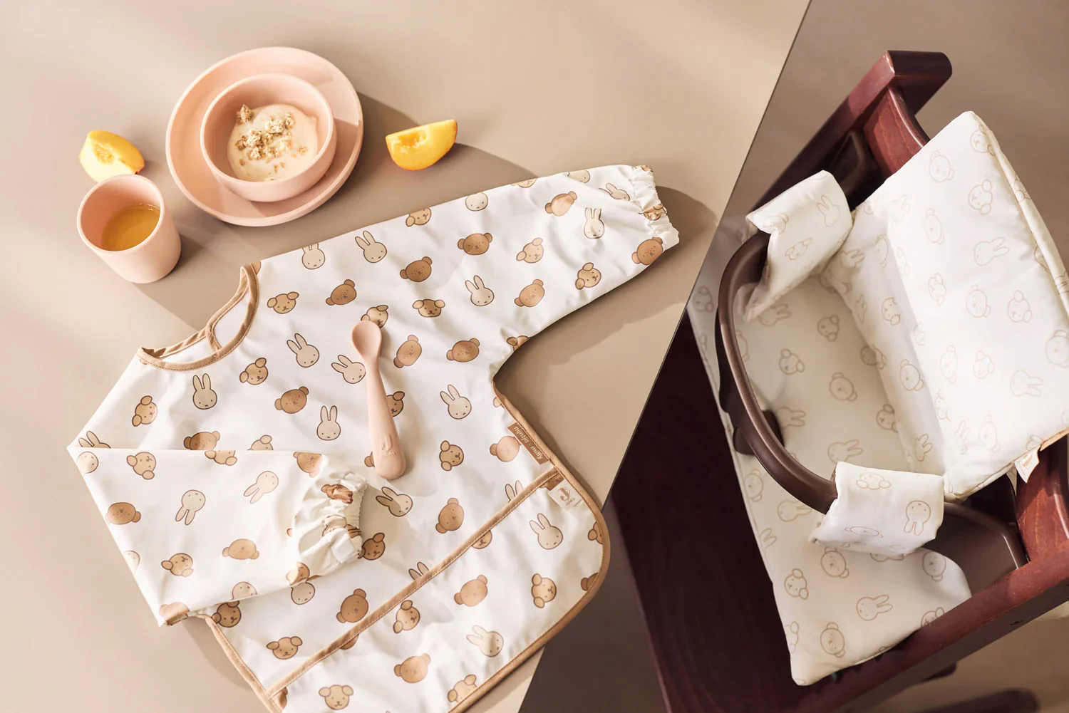 Práctico, alegre y funcional, el babero impermeable de manga larga Miffy y sus amigos es un imprescindible para mantener a tu bebé limpio, seco y lleno de estilo. 🌼