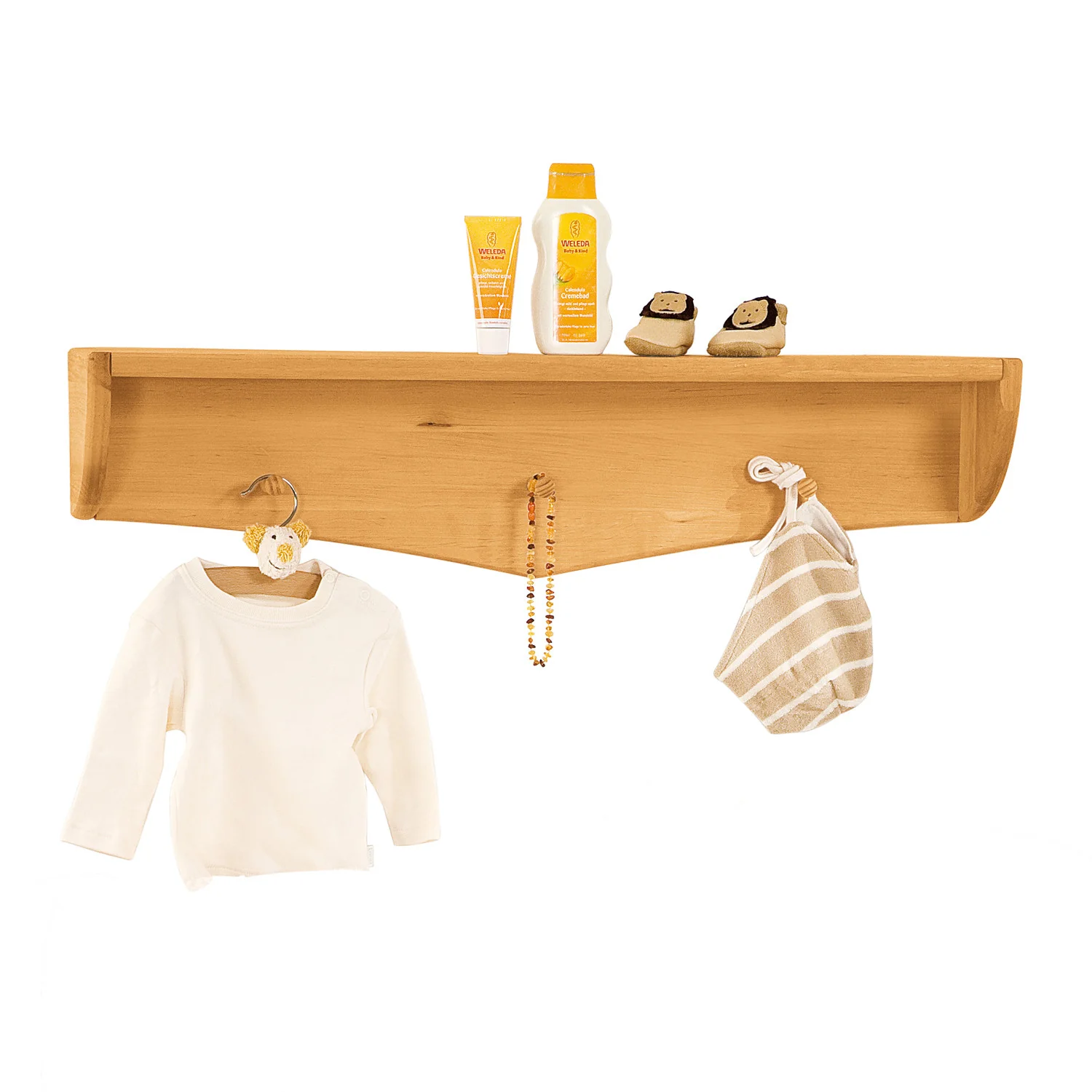 Perchero con líneas claras y balda incluída. Dispone de tres ganchos de madera con forma de lápiz. Realizado en madera de aliso biológica.