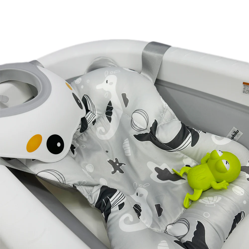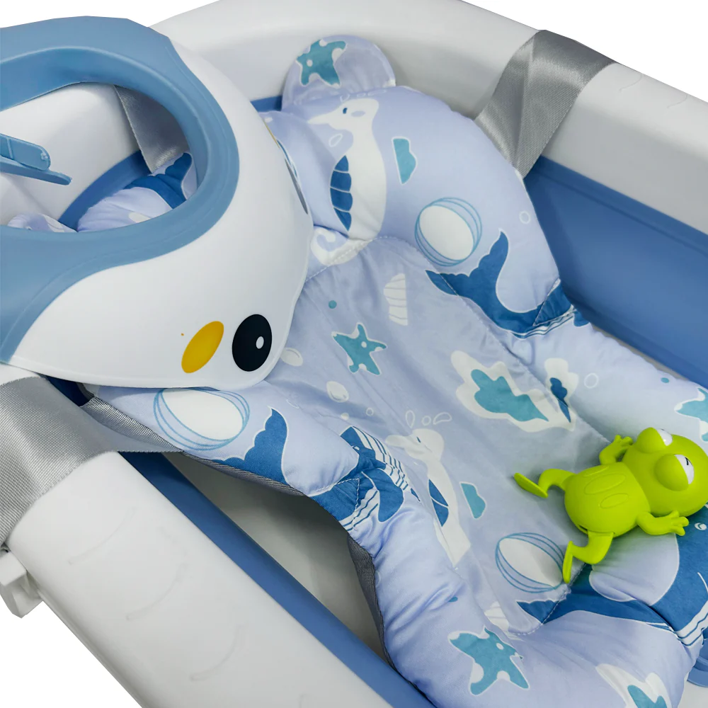 Esta innovadora bañera plegable es perfecta para el baño seguro y cómodo de tu bebé. Diseñada con materiales de alta calidad, cuenta con un cojín ergonómico y suave con un diseño de estrellas que proporciona un soporte ideal para el bebé durante el baño.