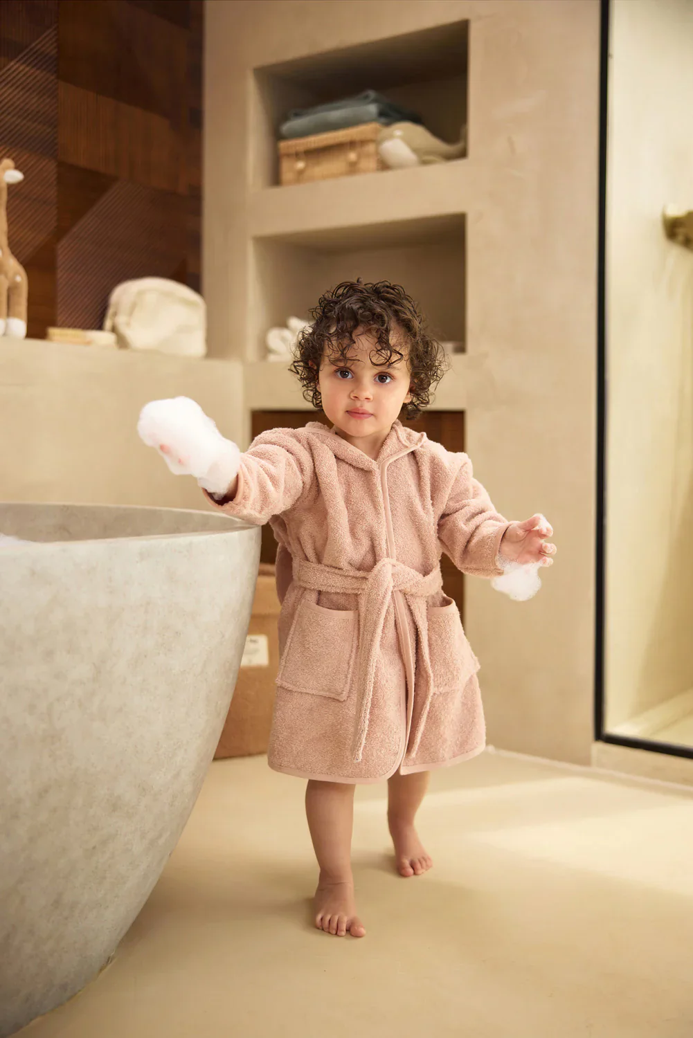 Esta bata de baño infantil de algodón rizo con orejitas es la prenda perfecta para envolver a tu peque con suavidad después del baño, la ducha o un chapuzón en la piscina. El tejido de algodón 100% rizo, ultra absorbente y cálido, mantiene seco y cómodo al bebé.