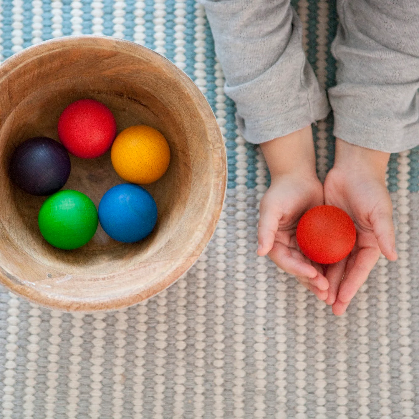 Sencillas y bonitas. Teñidas con mucho cuidado y con bello acabado. Así son las bolas de madera de Grapat. Un material que dará mucho juego en casa. Para contar, hacer rodar, cargar, clasificar…