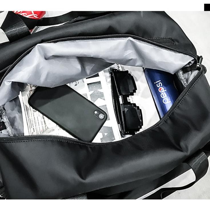 Esta gran bolsa de deporte con acabado satinado es impermeable y dispone de un bolsillo impermeable para su toalla o ropa después de hacer deporte. También tiene un bolsillo lateral para sus zapatillas. Una bolsa útil, práctica y a la moda disponible en cuatro colores para hacer deporte o viajar.
