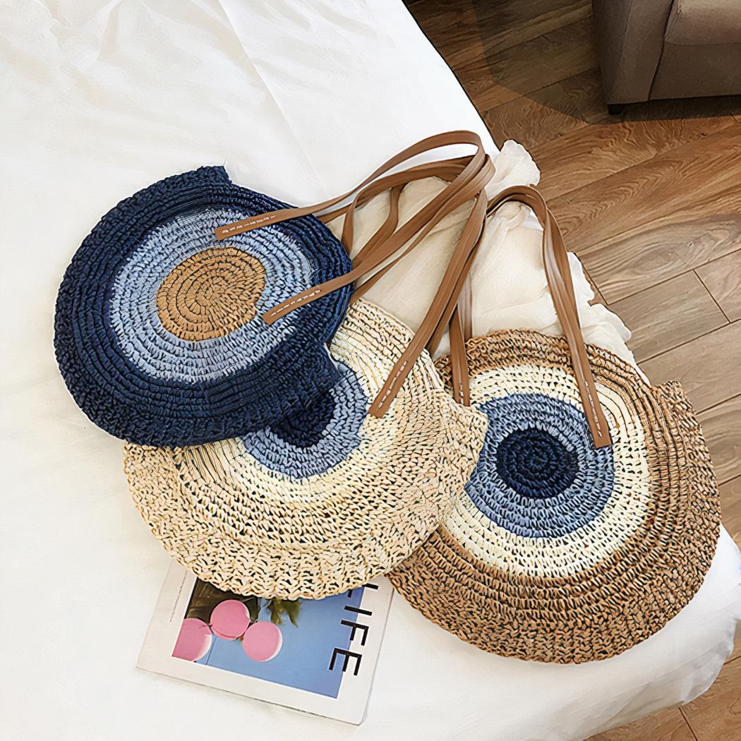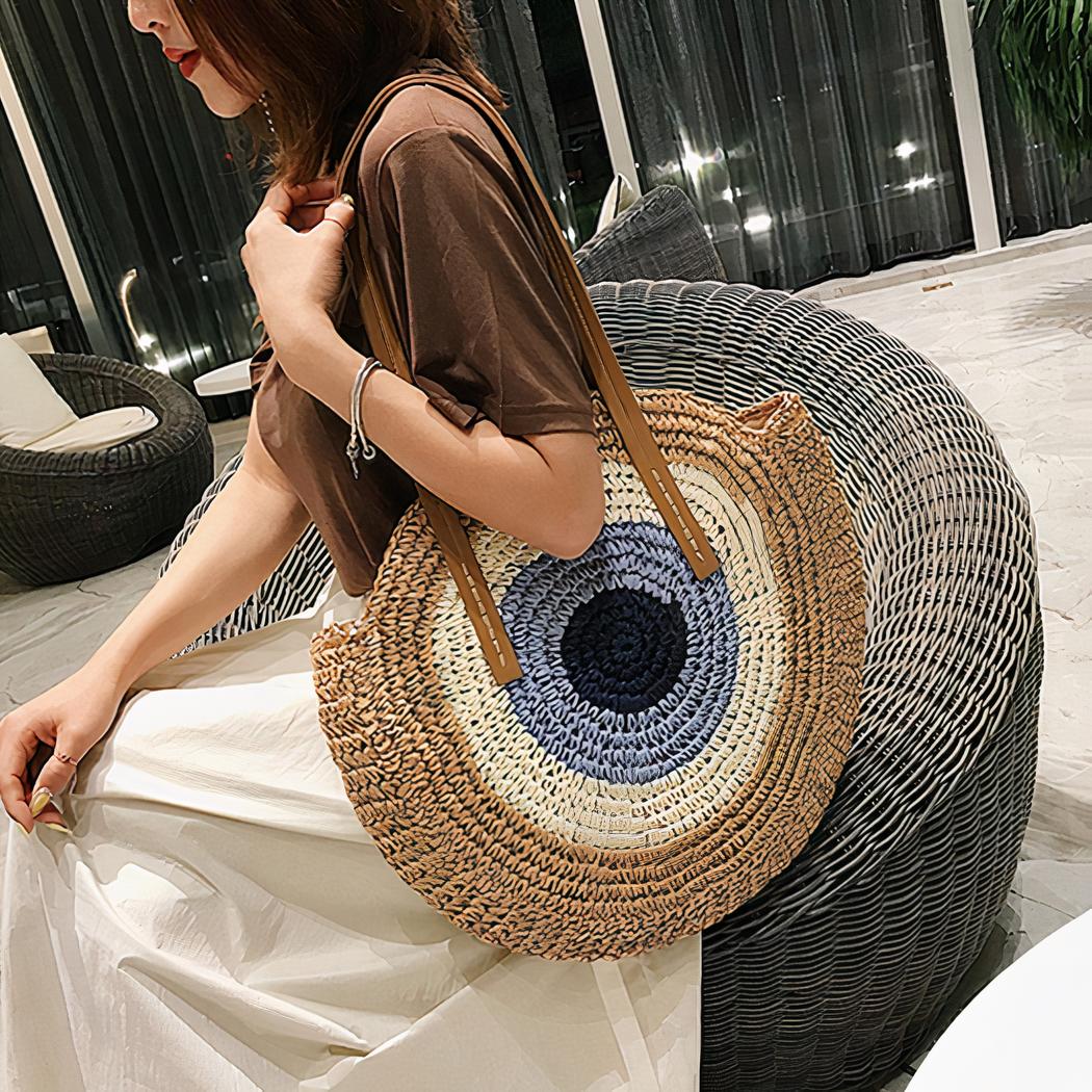 Bolsa de playa redonda de paja tejida para mujer