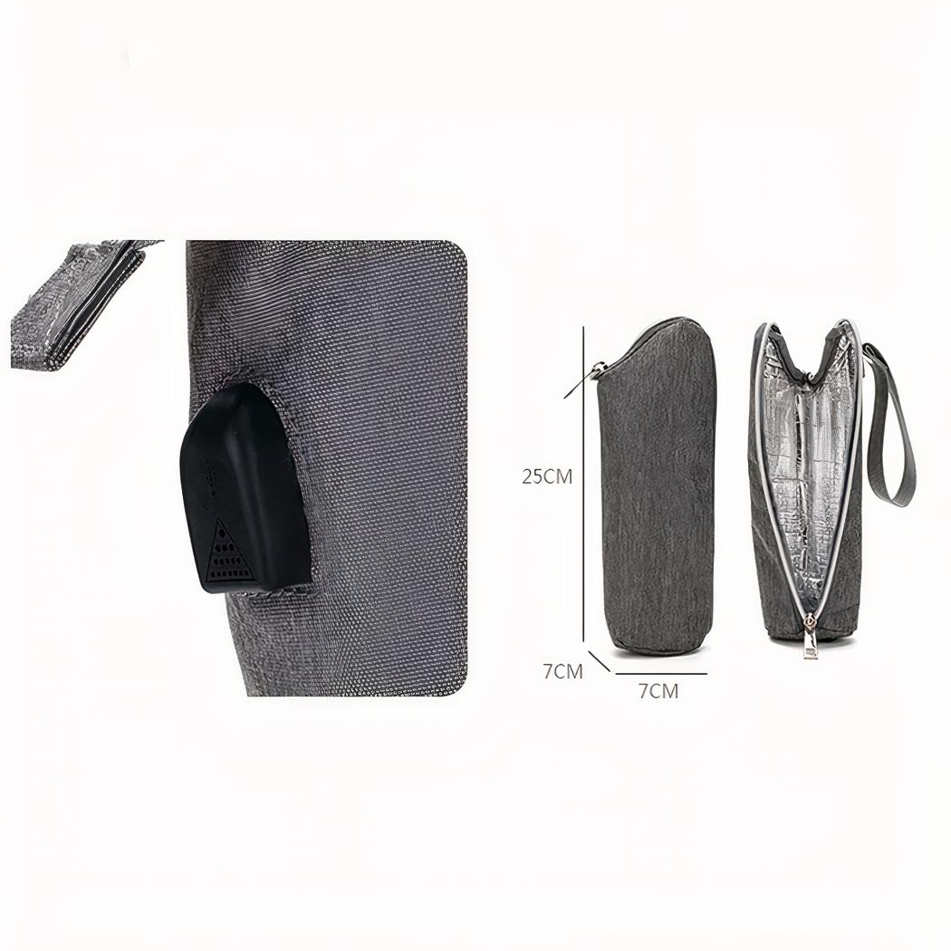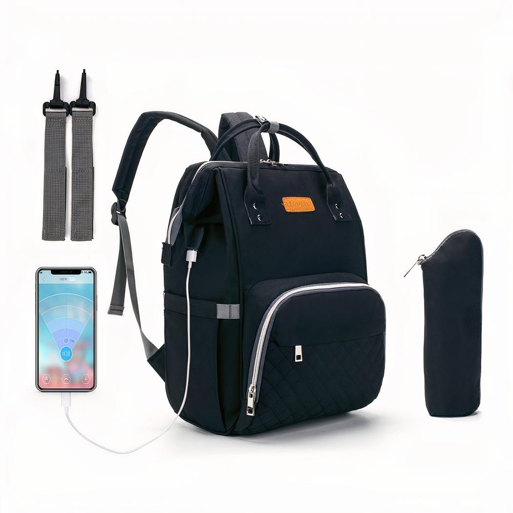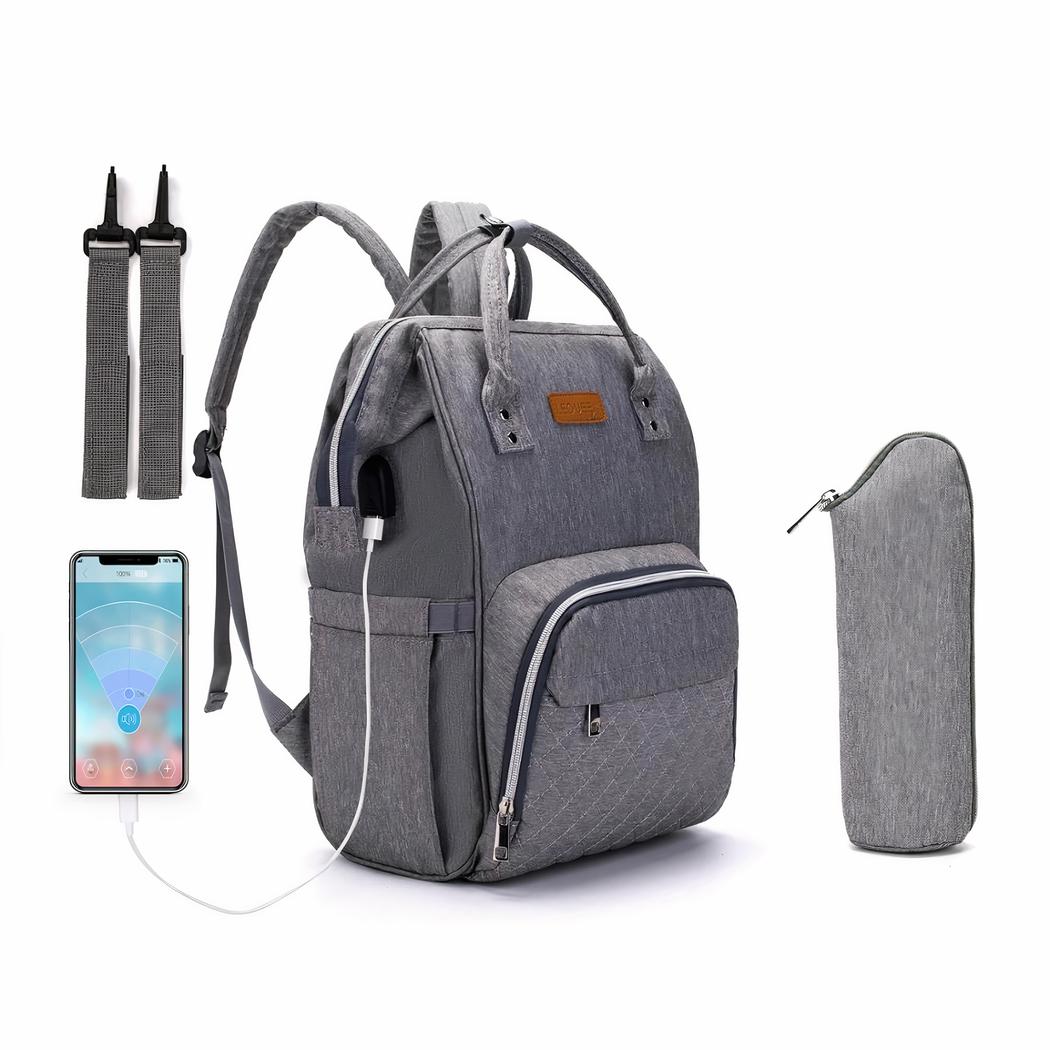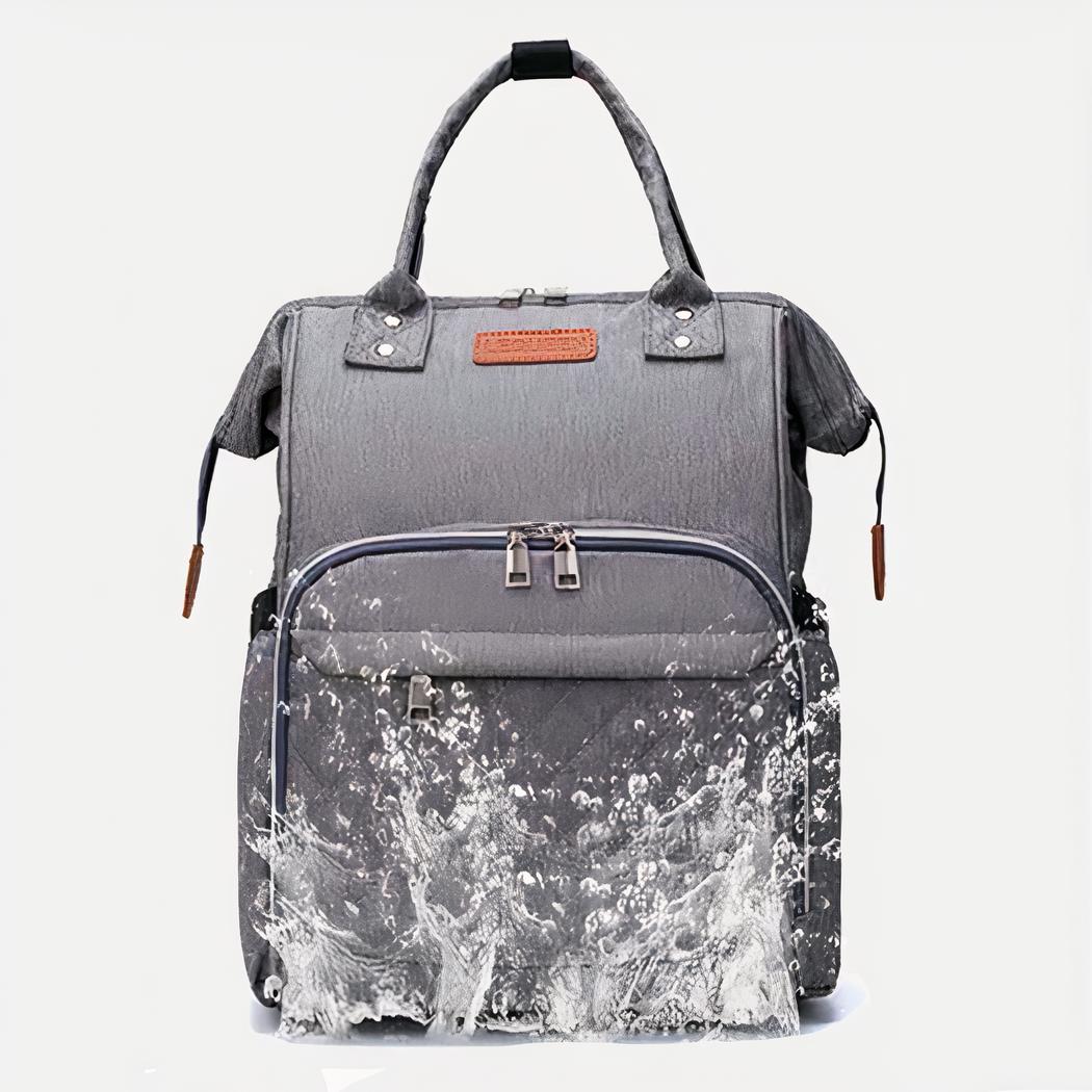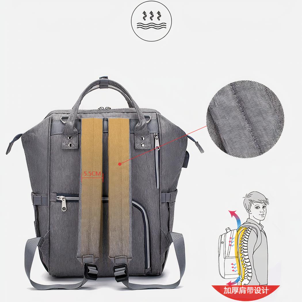 Una bolsa cambiador con puerto USB y bolsa isotérmica para padres a la moda. Esta mochila es muy práctica, con muchos bolsillos, una interfaz USB y una bolsa isotérmica por si fuera poco. Es impermeable y tiene un bolsillo exterior para toallitas con una pequeña ranura.