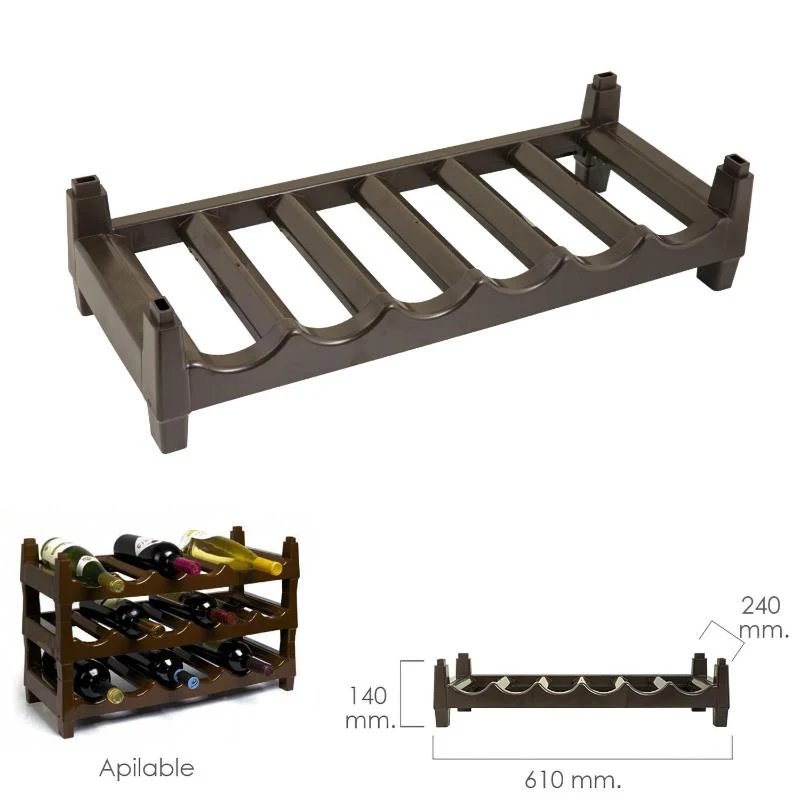 Soporte botellas apilable- Medida: 61x24x14 (alt) cm.- Capacidad para 6 botellas.- Realizado en plástico.- Ideal para cocina, garajes, bodegas, etc.