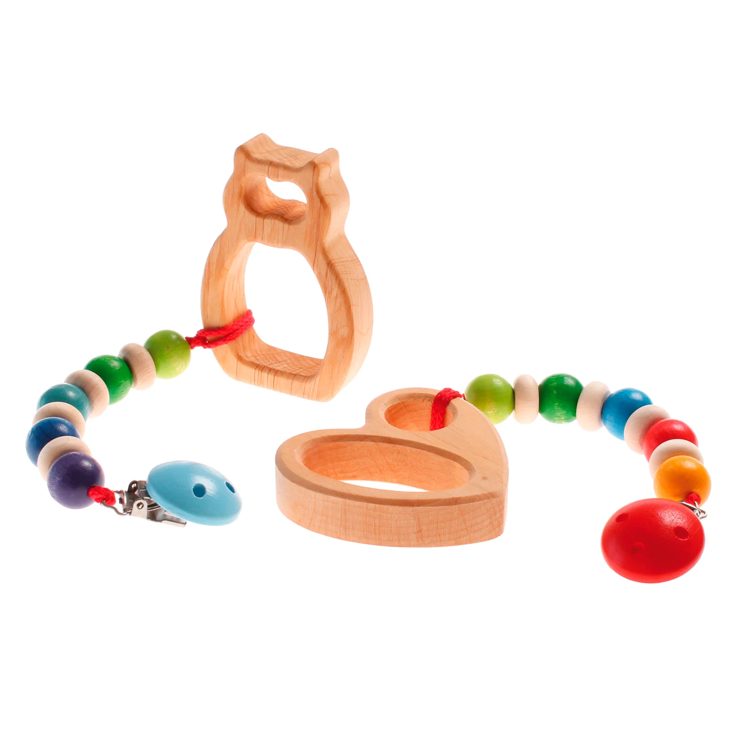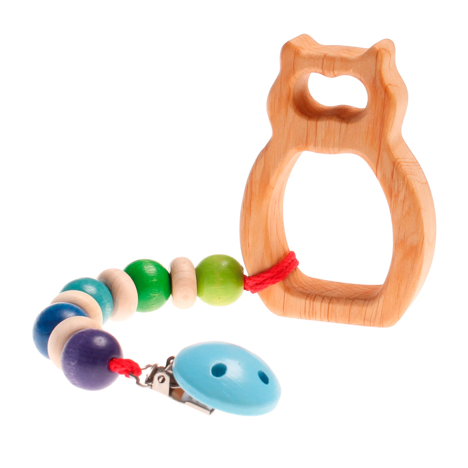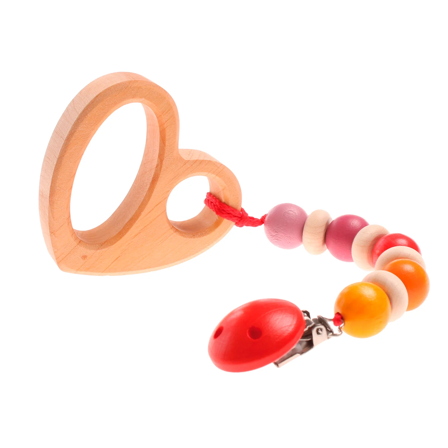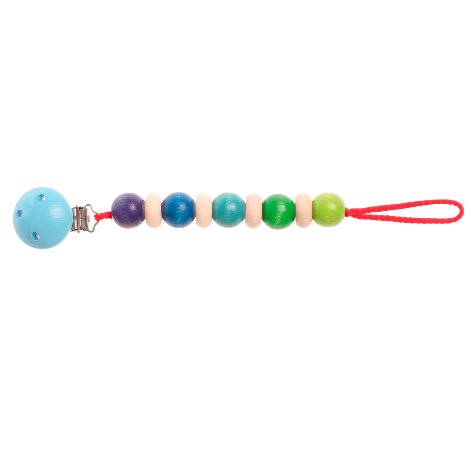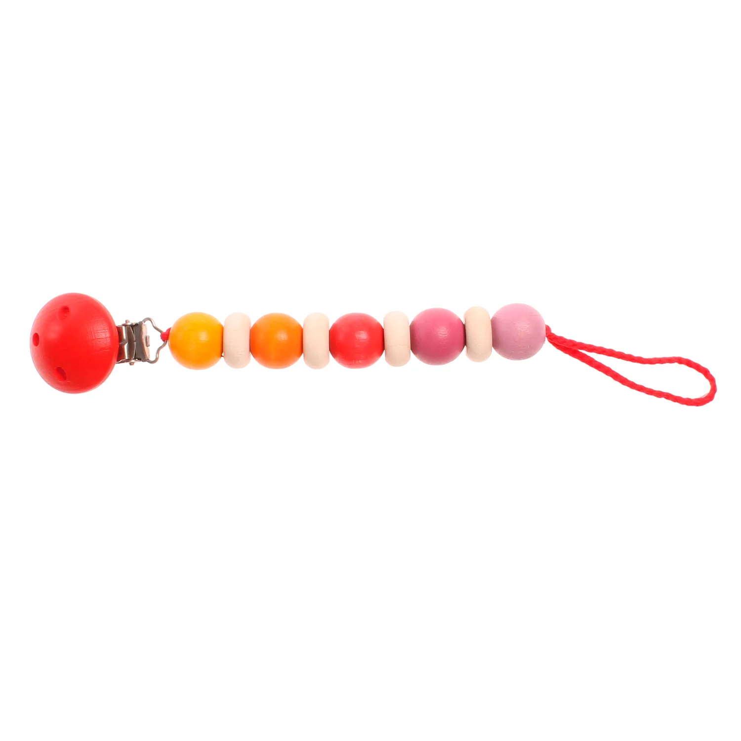 Cadena de madera con clip. Formada por bolas de colores y discos de madera. La madera de la cadena está tratada de forma totalmente natural con aceites y tintes vegetales de primera calidad.