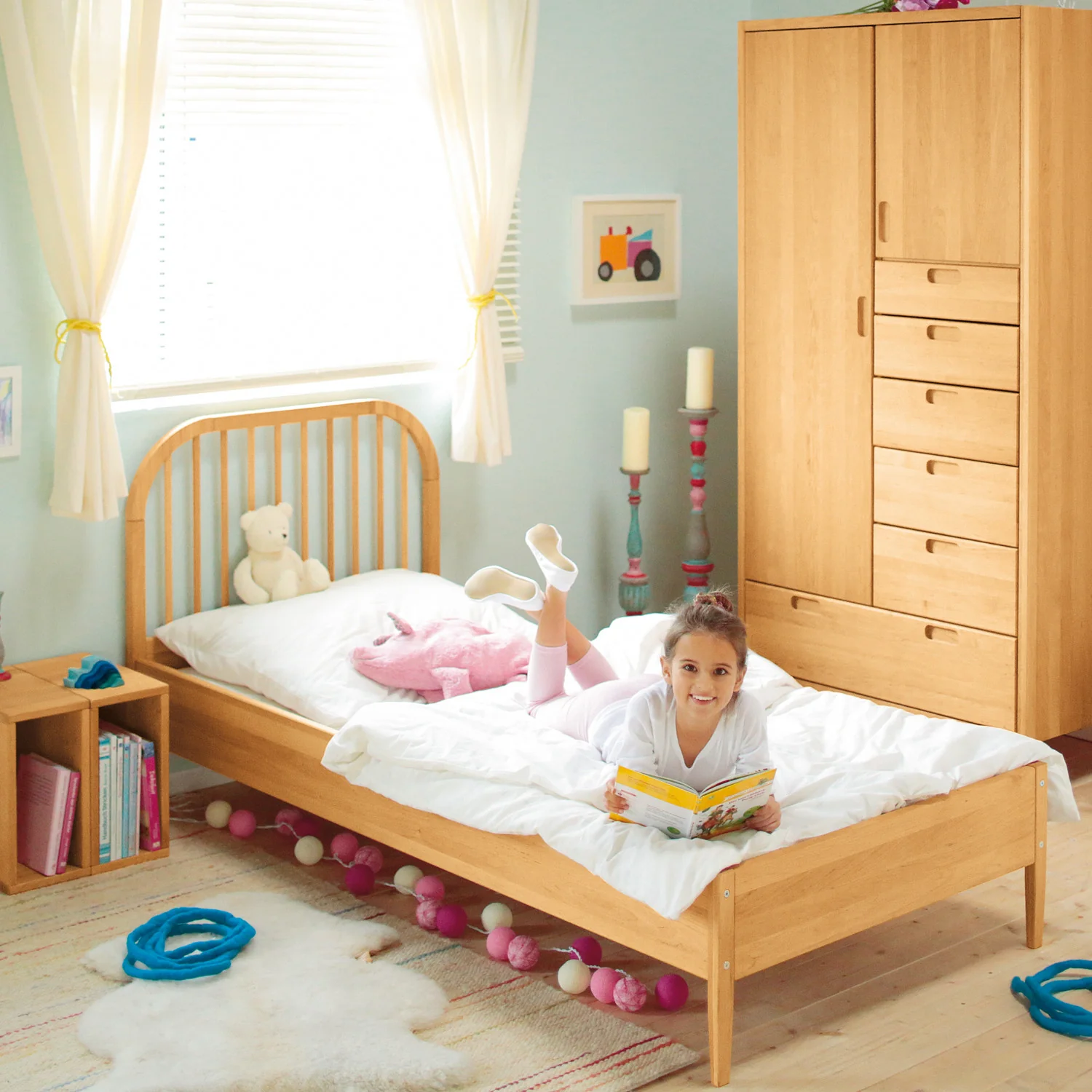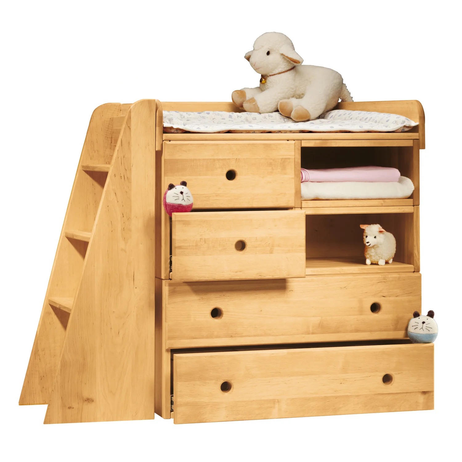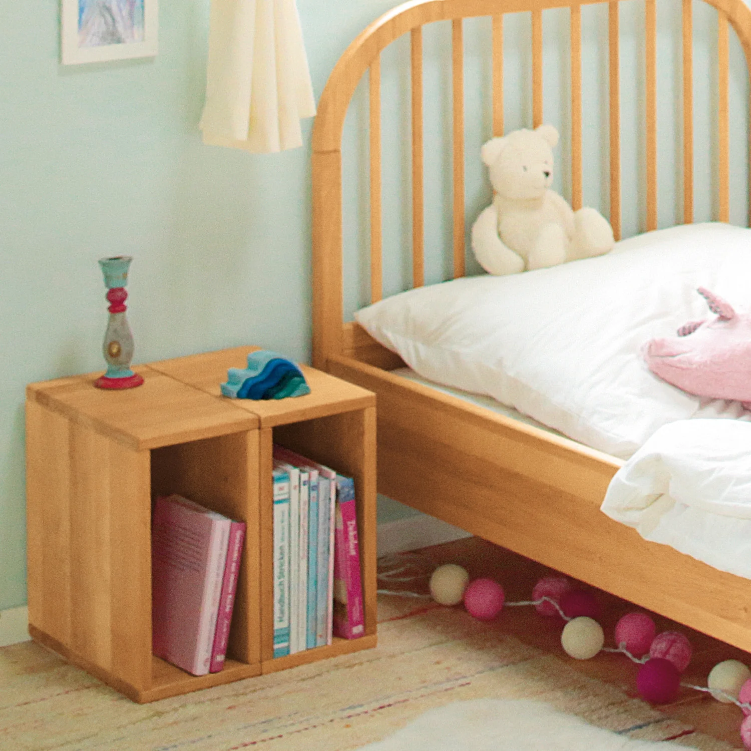 Ofrece una gran variedad de opciones de organización. Se puede añadir al cambiador, para guardar las cremas y los pañales, por ejemplo; o añadir al armario del niño para colocar sus juguetes. Fabricada en madera de aliso ecológica con grosor de unos 2 cm, está tratada con aceites y ceras naturales.