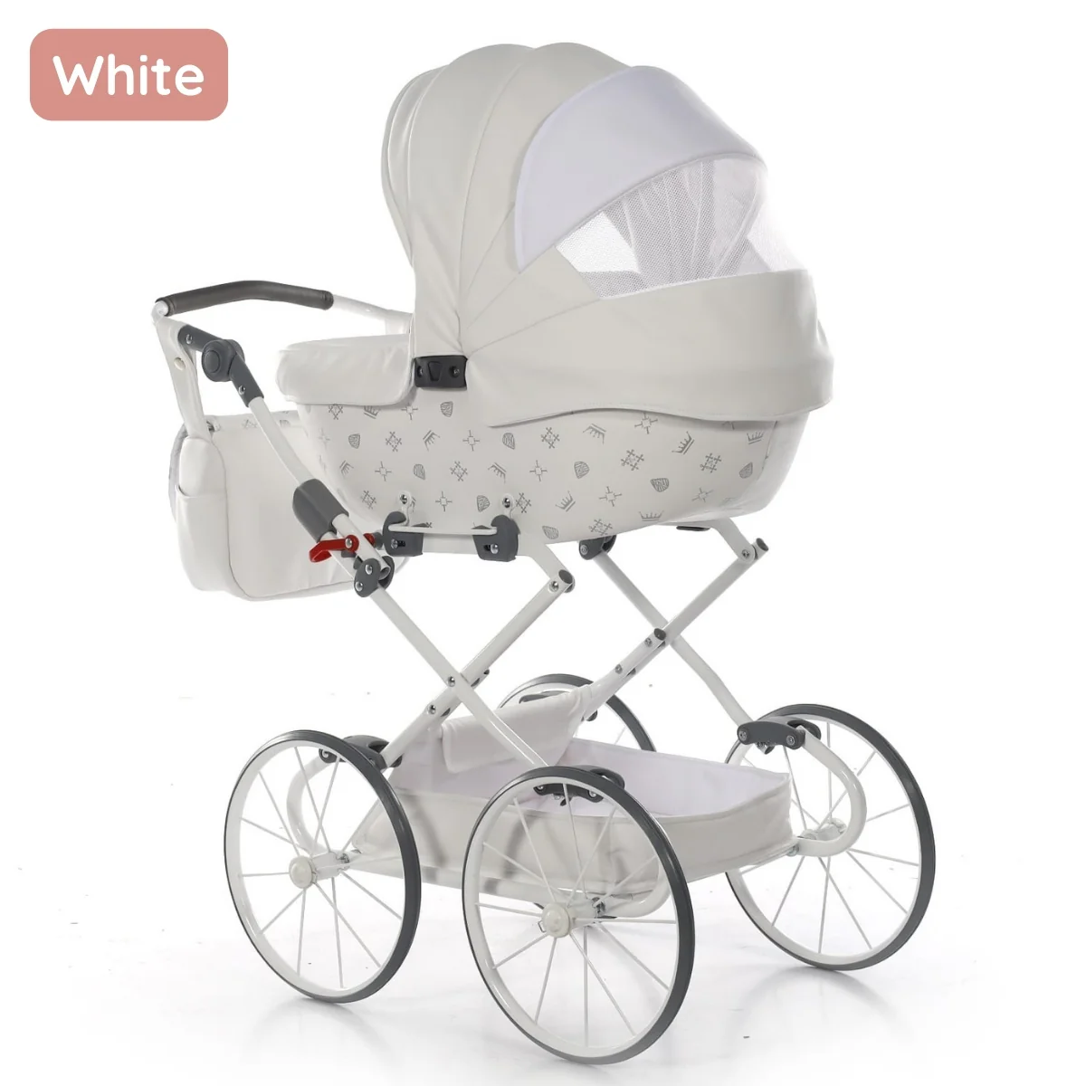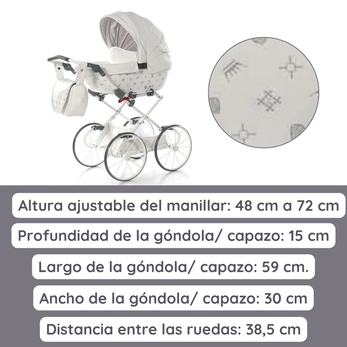 Paseos con Estilo y Elegancia Con el Carrito de Muñecas Imperial Classic de Junama, tus pequeños podrán disfrutar de largos paseos mientras juegan y se divierten. Su original diseño combina símbolos en acabado metalizado, añadiendo un toque estiloso y sofisticado al carrito. Además, su ligereza permite que los más pequeños lo manejen con facilidad, y las ruedas de poliuretano estilizadas no requieren mantenimiento. Imperial Classic Junama es una maravillosa opción para transportar tus muñecas o peluches favoritos.