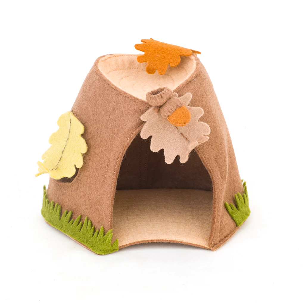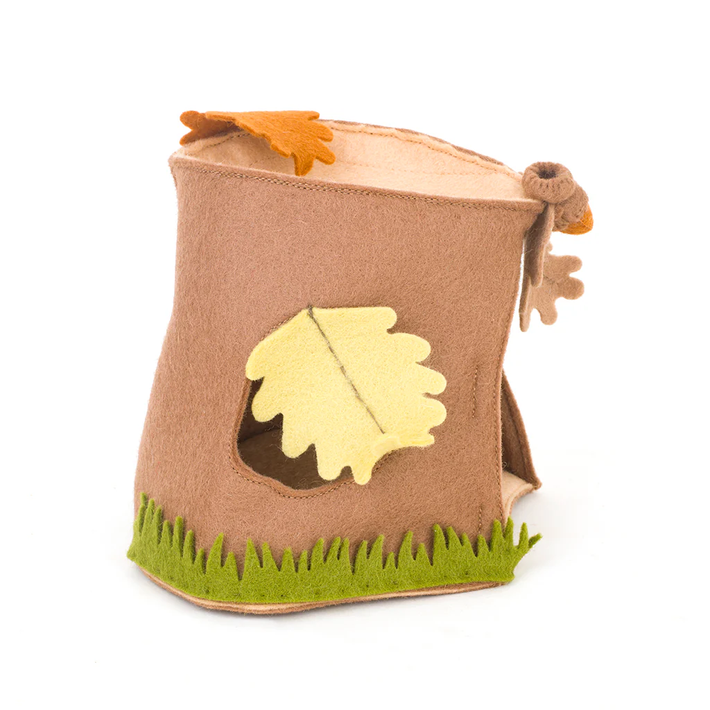 Preciosa casa del bosque realizada artesanalmente con fieltro de lana 100%. Estupendo hogar para los duendecillos del bosque. Un complemento ideal que dará mucho juego, sin duda, en la mesa de estación.