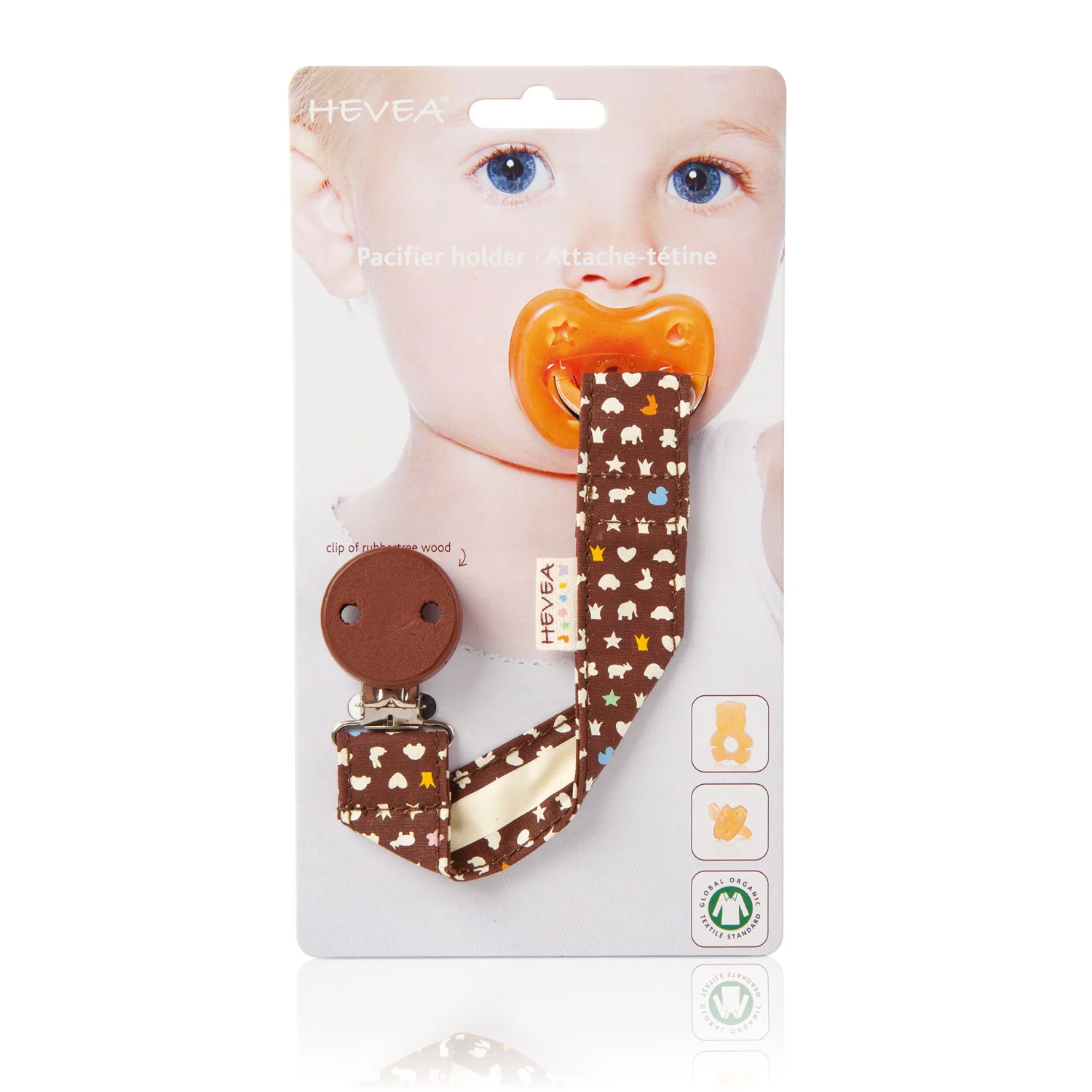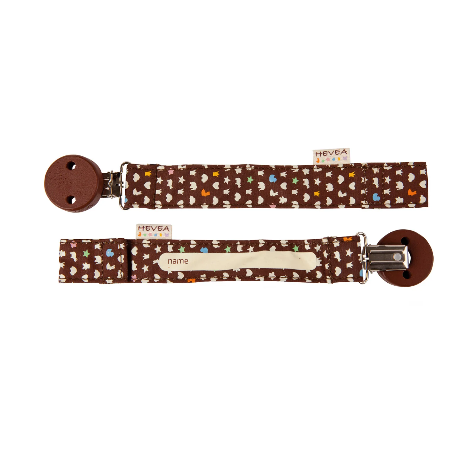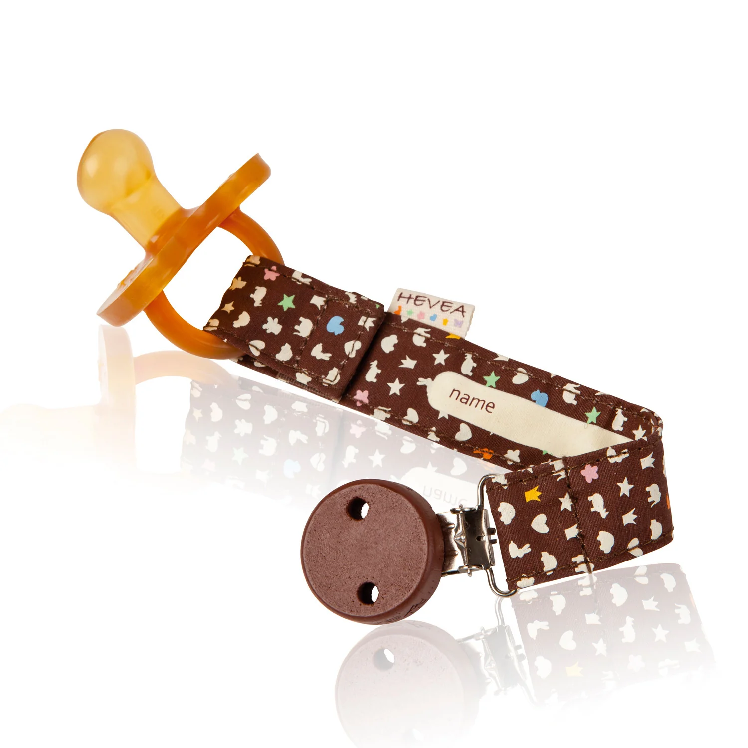 Cinta para sujetar el chupete o mordedor y evitar que se pierda o caiga al suelo. Realizada en algodón orgánico, de diseño en color marrón. Su diseño tiene un espacio para escribir el nombre del bebé. Las pinzas de la cinta son de madera del ábol de látex con el que se realizan los chupetes de la conocida marca Hevea. Dispone de velcro para sujetar el chupete o mordedor. Disponible en 4 bonitos colores: azul, rosa, verde y marrón.