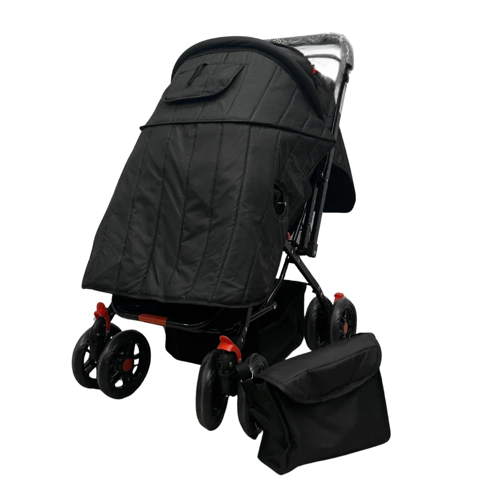 El coche incluye un cobertor amplio y acolchado que cubre por completo al bebé, ideal para protegerlo del viento, el sol, la lluvia ligera o el frío. Incorpora ventanas laterales con malla para mantener la ventilación adecuada sin perder visibilidad.