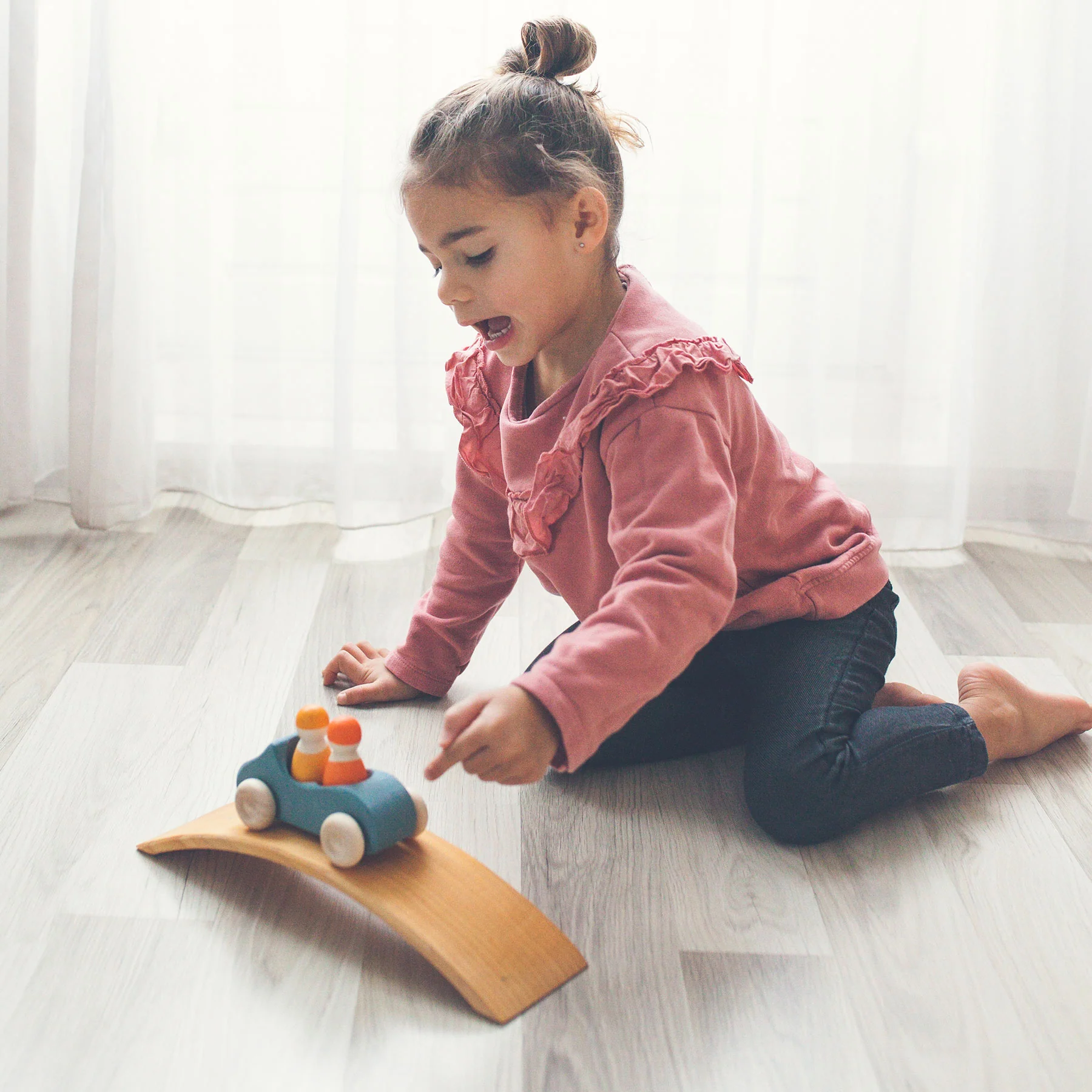 Descapotable de madera azul con dos pasajeros de color amarillo y naranja. Realizado en madera de tilo coloreado con tintes no tóxicos a base de agua, alegrará las tardes de los pequeños de la casa.