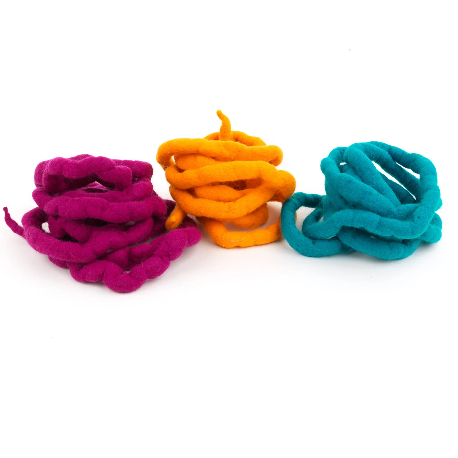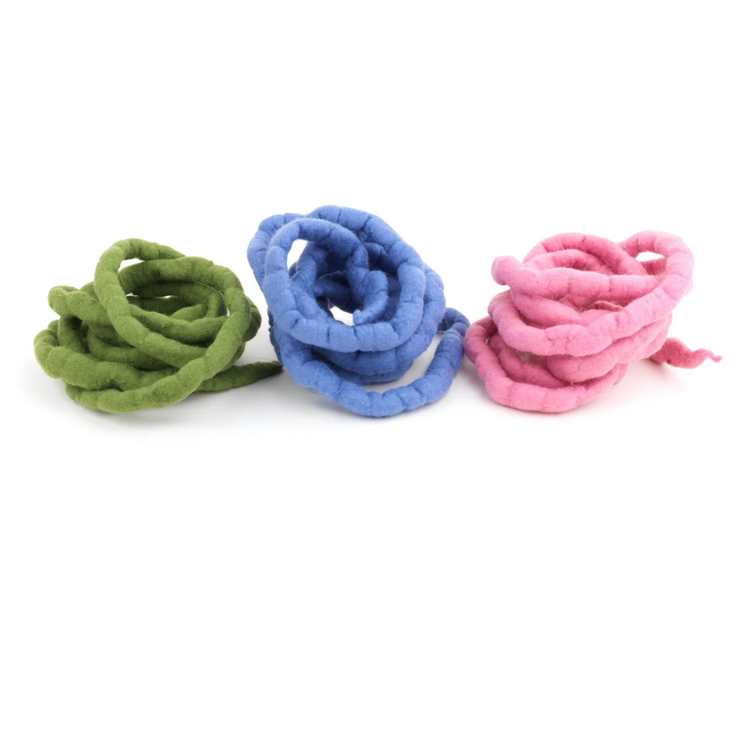 Resistentes cuerdas de juego realizadas artesanalmente con 100% lana de oveja merina teñida de diferentes colores. Se incluyen 3 cuerdas de 2 metros de longitud cada una en packs de diferentes colores: colores primarios (rojo, amarillo y azul), colores pastel (rosa, verde hierba y azul claro) y colores vivos (rosa ciclamen, azul turquesa y amarillo dorado).