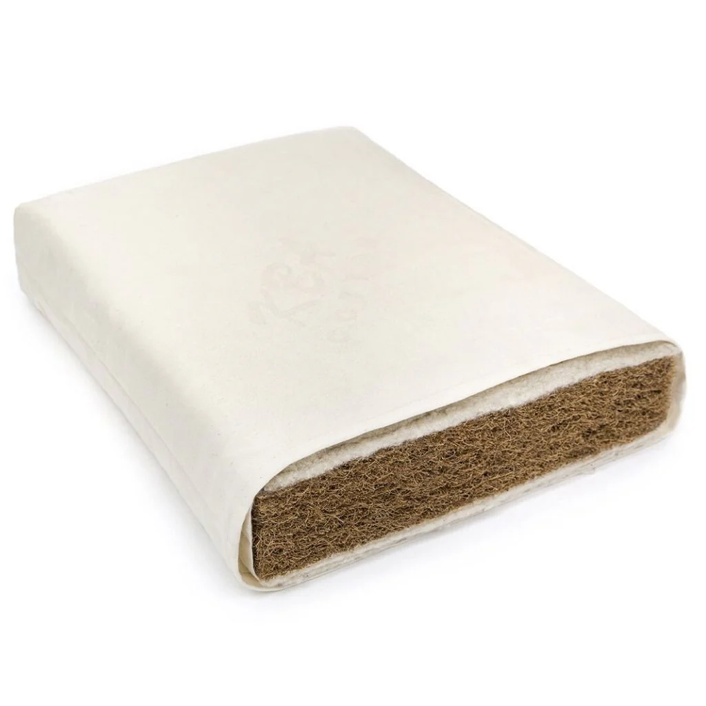 • Colchón ecológico certificado KBA (130 x 70 cm). Realizado con coco recubierto de látex natural y una funda de lana virgen orgánica (500 g/m2, Oeko-Tex® Standard 100). La funda se puede lavar a máquina 60º