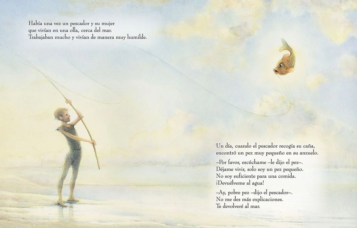 Un pescador y su mujer viven en una olla, cerca del mar. Un día el hombre pesca un pez que le habla y que le suplica que lo libere. El pescador lo hace de buena gana. Al volver a casa, su mujer lo riñe diciéndole que seguro que aquél era un pez de los deseos y lo obliga a regresar para pedirle una casita más grande. Su deseo crece y crece cada vez más hasta que su ambición llega al límite.