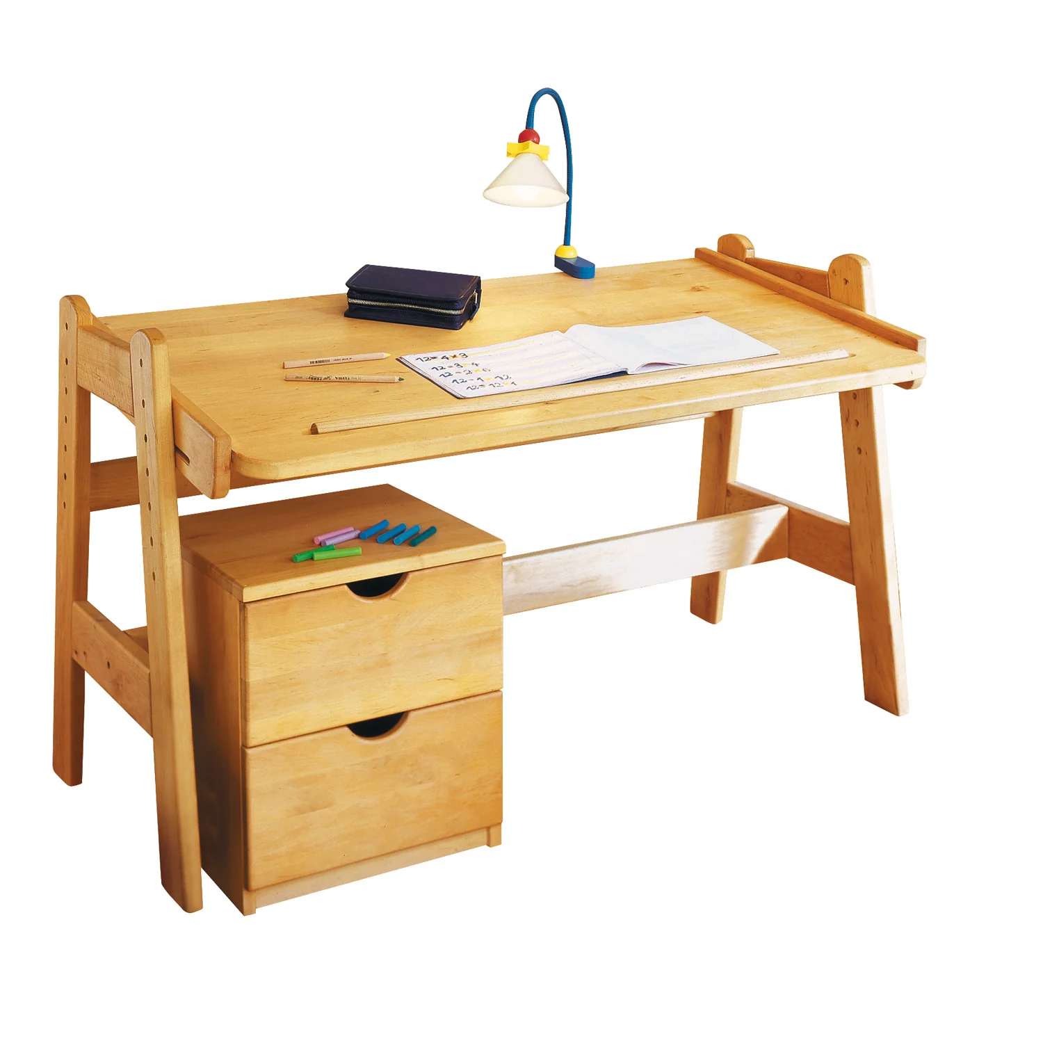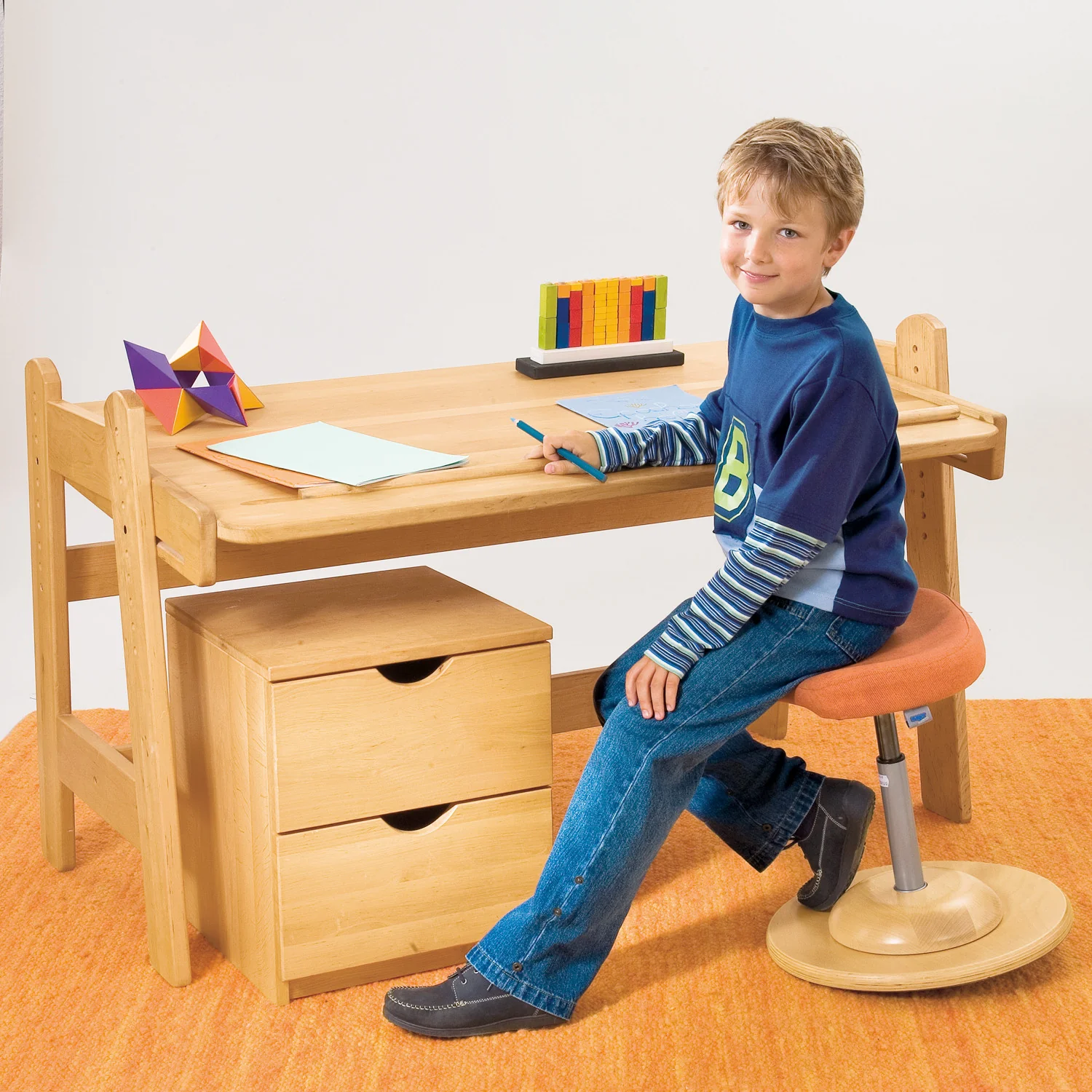 Fabricado completamente en madera maciza de aliso ecológica con la superficie trabajada con aceite Livos biológico, este escritorio acompaña al niño hasta la edad adulta. Tiene un gran tablero que se puede regular a la altura deseada y darle la inclinación perfecta para que el niño tenga la mejor postura al sentarse a hacer los deberes o a dibujar. Dispone de una pequeña muesca en la superficie de la mesa para dejar los lápices y debajo hay sitio para colocar la cajonera con ruedas. Dispone de portamochilas y de una varilla con ganchos. Se puede combinar con la Caja de lápices Emilia, Cajón para escritorio Emilia, Colgadores para Escritorio Emilia, Colgador para Escritorio Emilia, la Cajonera Emilia, Bandeja de Escritorio Emilia y el recipiente para lápices Emilia.
