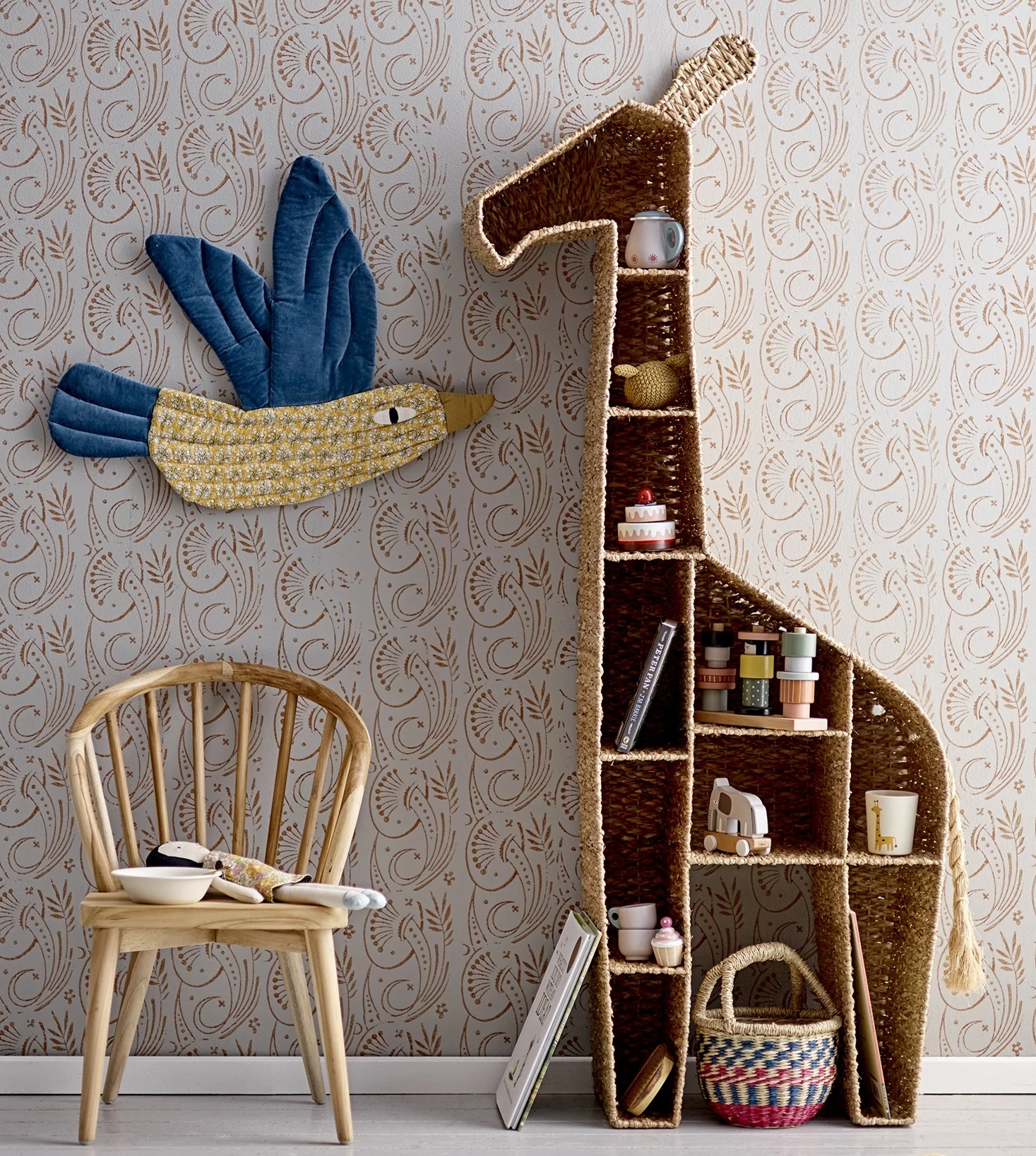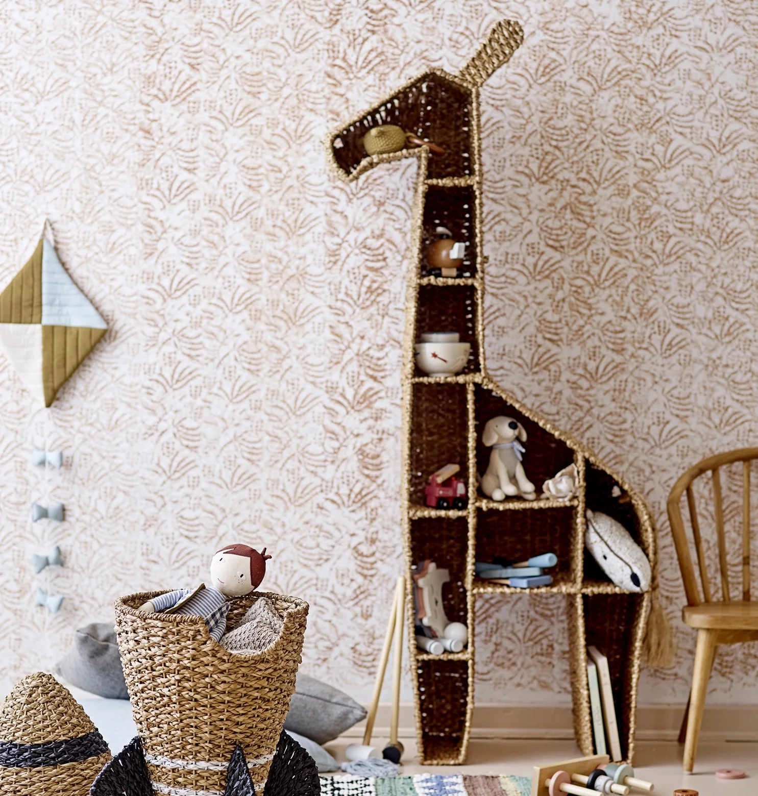 Estantería de ratán en forma de alta jirafa. Para tener bien organizados adornos y juegos de los pequeños de la casa.