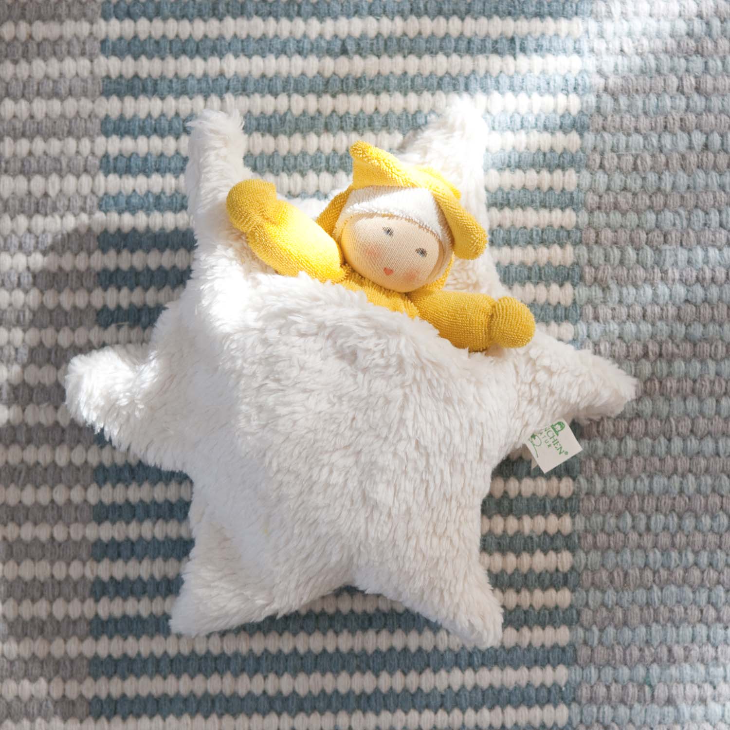 Tierna y suave juguete musical con cuna en forma de estrella ideal para trabajar el juego simbólico. Todo elaborado en algodón orgánico de primera calidad.