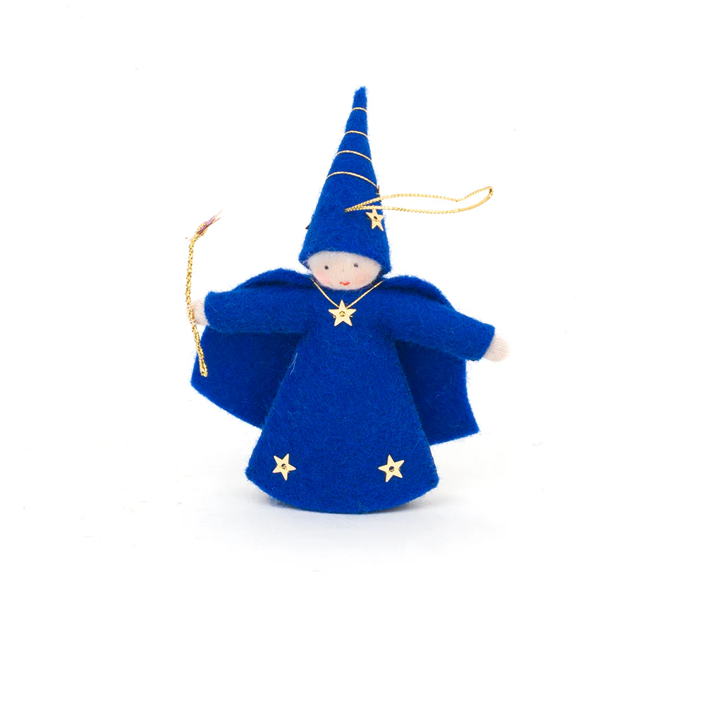 Preciosa y delicada figurita mago para colgar . Es verdaderamente increíble cómo está cosida con esmero y dedicación. Cada detalle y cada puntada hacen que sea mágica. Os va a enamorar. Con gorro, capa varita y estrellitas doradas.