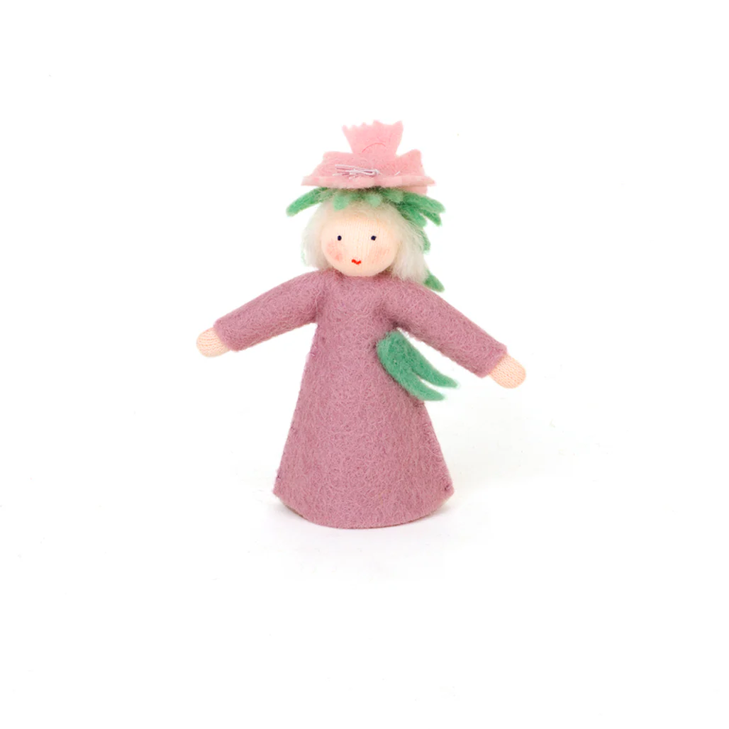Delicada hadita flor clavel vestida de colores rosas y verdes. Sus brazos son articulados y tienen una buena base para que quede firme en la mesa de estación.