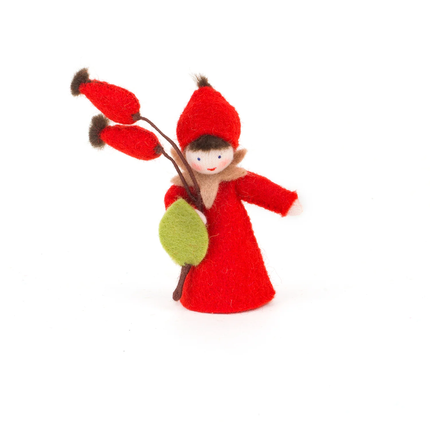 Delicada hadita con escaramujo en la mano realizada en fieltro con cuidado y detalle. Con brazos articulados y buena base para que quede firme en la mesa de estación.