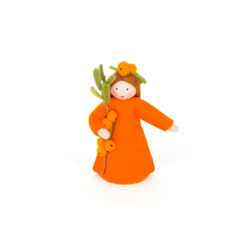 Delicada hadita del espino amarillo vestida con un alegre vestido y rodeada de bayas.. Con brazos articulados y buena base para que quede firme en la mesa de estación. Sus bayas redondas de color amarillo anaranjado se recolectan en otoño.