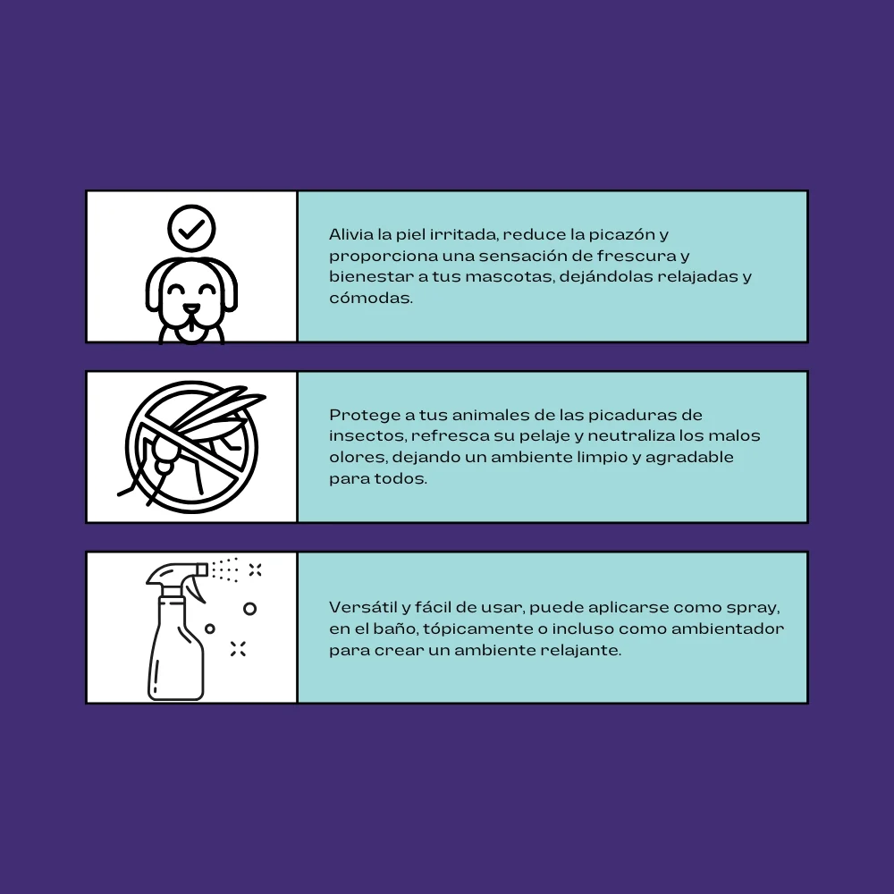 El hidrolato es ideal para baños relajantes que limpian profundamente y mantienen la piel y el pelaje protegidos. Su efecto mantiene a raya insectos molestos como mosquitos y pulgas. Para usos prácticos, puede aplicarse como neutralizador de olores en el animal o pulverizarse en camas, instalaciones o ambientes para mantener una atmósfera limpia y fresca.