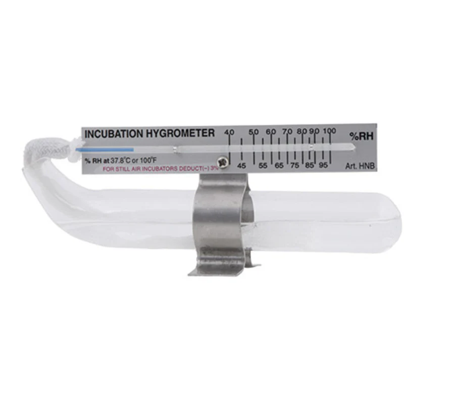 Higrómetro de pabilo para comprobar la humedad de incubadoras, nacedoras y terrarios. Muy fiable y fácil de utilizar. Simplemente tenemos que llenar el tubo de cristal con agua (para un correcto funcionamiento siempre debe tener más de 1/3 de agua) y esperar a que la mecha o pabilo embeba el agua. Una vez que la parte superior de la mecha esté mojada, es el momento de introducirlo en la incubadora, esperamos una media hora y obtendremos el dato de la humedad dentro de la máquina. El higrómetro nos marca la humedad relativa en una escala de 40 al 100%. Para alargar la vida del higrómetro recomendamos utilizar siempre agua destilada y aconsejamos renovar el pabilo en cada ciclo de incubación.