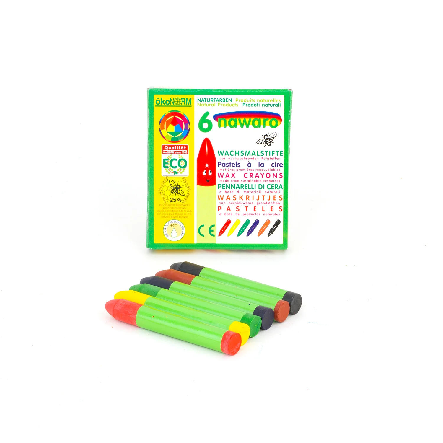 Estuche de cartón con 6 lápices de cera completamente natural realizada con cera de abeja (mín. 25%), otras ceras vegetales, colorantes alimentarios y pigmentos naturales.