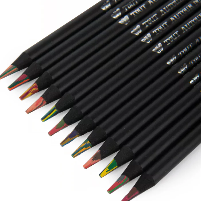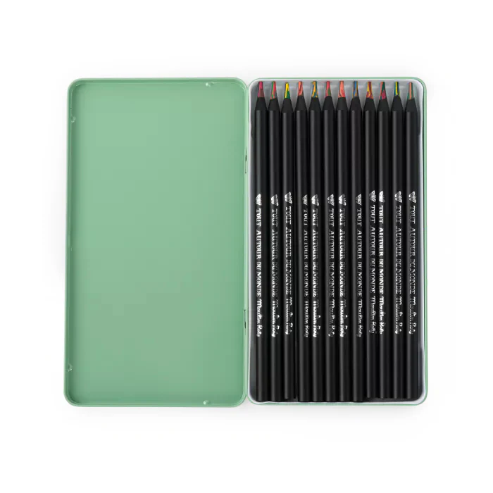 Este estuche contiene 12 lápices multicolores, con minas mágicas que combinan varios tonos en un solo trazo. Al girar el lápiz, cambia el color como por arte de magia.
