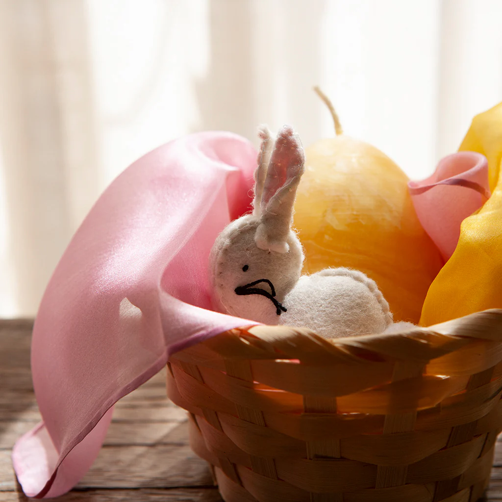 Preciosa y delicada liebre en tonos blancos y rosas. Ideal para contar cuentos, como juguete o o decoración.