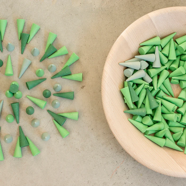 Material bello y sencillo para el juego fabricado artesanalmente por Grapat. Contiene 36 piezas de madera en distintas tonalidades de verde. Crear mandalas, imaginar, disfrutar… Combinados con otros elementos de juego de Grapat son ideales para dar rienda suelta a la imaginación e imaginar historias y aventuras.