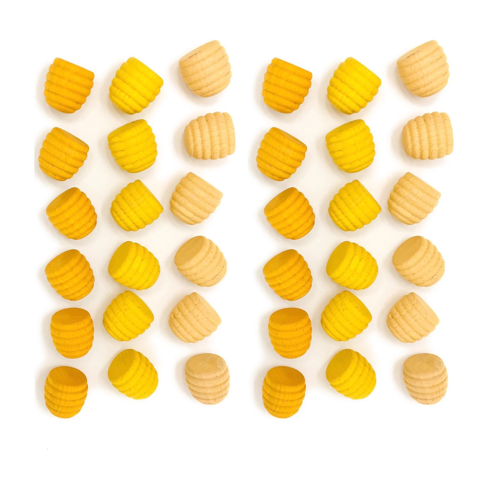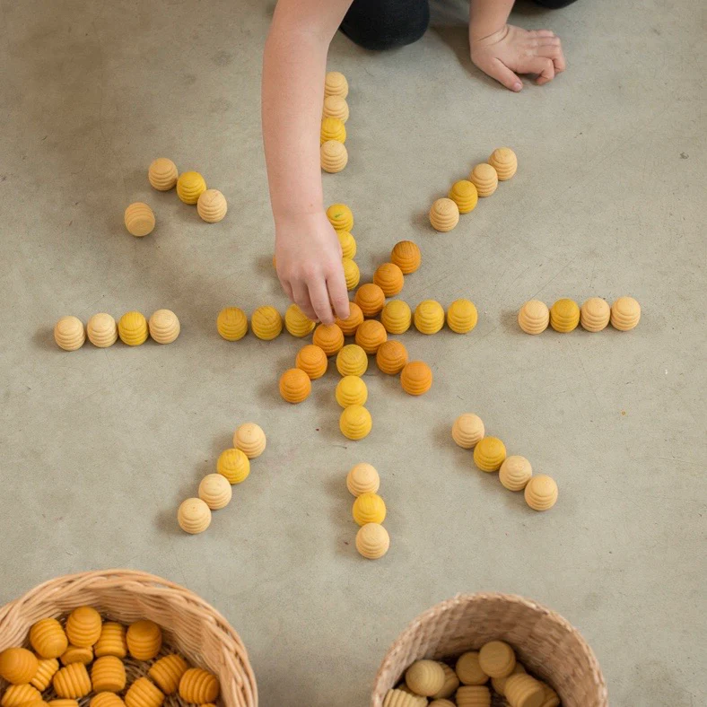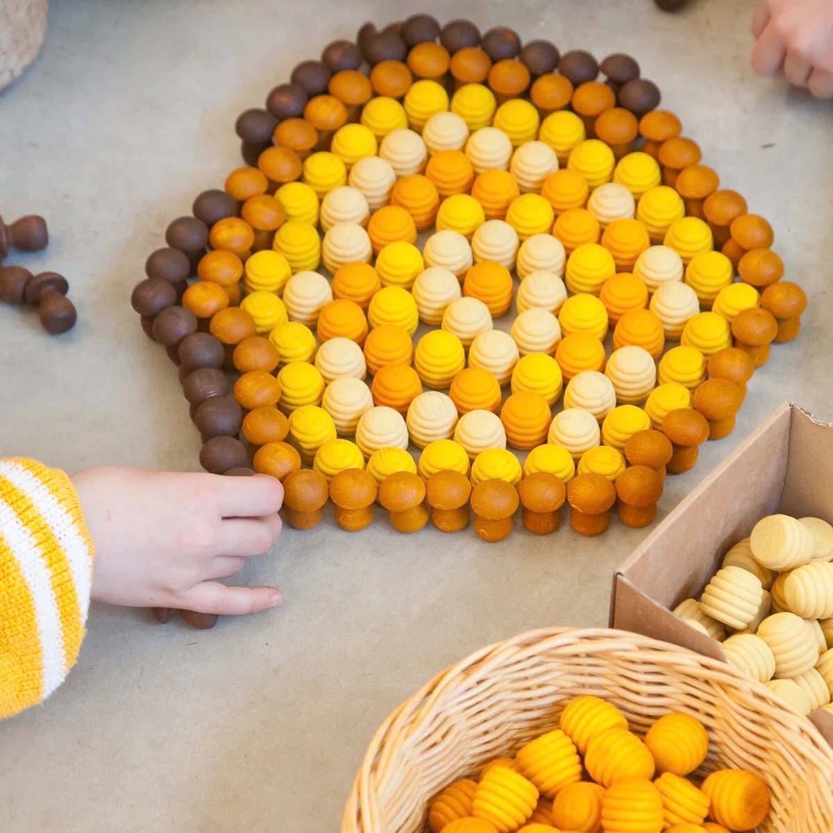Material bello y sencillo para el juego fabricado artesanalmente por Grapat. Contiene 36 piezas de madera en distintas tonalidades de amarillo. Crear mandalas, imaginar, disfrutar… Combinados con otros elementos de juego de Grapat son ideales para dar rienda suelta a la imaginación e imaginar historias y aventuras.
