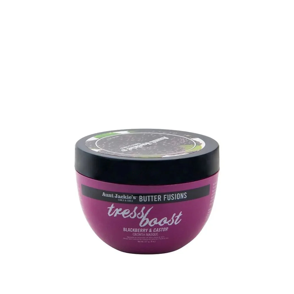 AUNTS JAKIE´S BUTTER FUSIONS TRESS BOOST – Blackberry & Castor Hair Growth Masque 240g es una mascarilla para el crecimiento del cabello Blackberry & Castor.