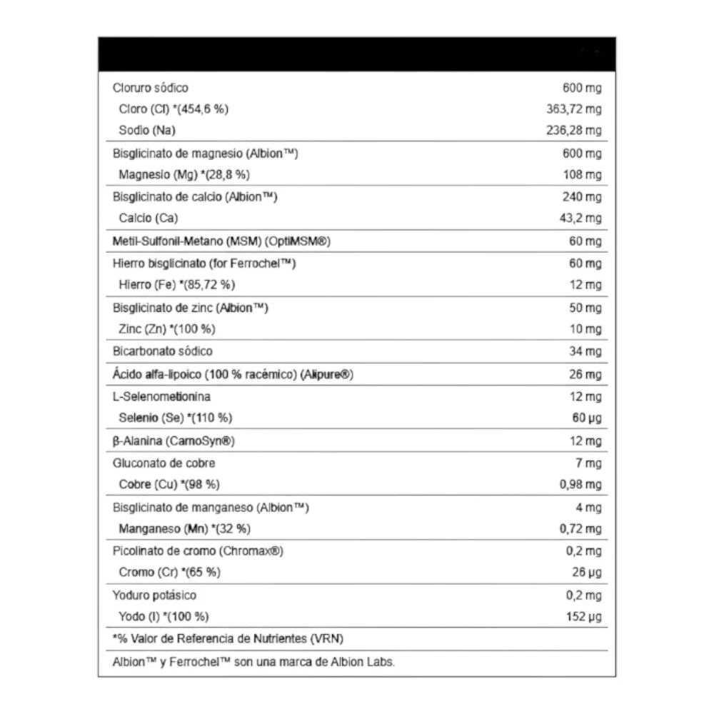 DescripciónMineral Complex de VitOBest es un suplemento en cápsulas vegetales que proporciona una combinación única de minerales diseñada específicamente para maximizar la hidratación celular, optimizar el rendimiento y la recuperación deportiva. Es una fórmula de electrolitos completamente única y novedosa que se presenta en cápsulas para una rápida y sencilla dosificación enfocada al consumo tanto previo, durante y posterior al ejercicio. Se trata de una fórmula avanzada basada en conceptos fisiológicos del funcionamiento del organismo durante el entrenamiento. Más que una fórmula de electrolitos, Mineral Complex se caracteriza por ser una fórmula coadyuvante al rendimiento y a la recuperación deportiva, pues aparte de estar compuesta por minerales, posee elementos tan importantes para el desempeño deportivo como la beta alanina o el ácido alfa lipoico.BeneficiosPrincipales beneficios de Mineral Complex de VitOBest: – Fórmula de electrolitos avanzada para el mantenimiento de la hidratación. – Ideal para tomar antes, durante y/o después del entrenamiento. – Reforzado con β-Alanina y ácido alfa-lipoico. – Favorece el equilibrio de la presión arterial durante el desarrollo del ejercicio. – Favorece el equilibrio de la concentración y distribución de sales minerales en el organismo. – Aumenta la biodisponibilidad del azúcar por parte de la célula muscular. – Ayuda al equilibrio del pH muscular durante el entrenamiento. – Minimiza los procesos catabólicos a nivel muscular. – Con cápsulas Vcaps®, las mejores cápsulas vegetarianas del mundo. – Permite una cómoda y precisa dosificación.IngredientesSodio cloruro, magnesio bisglicinato Albion®, calcio bisglicinato Albion®, metilsulfonilmetano, hierro bisglicinato Ferrochel®, zinc bisglicinato Albion®, sodio bicarbonato, Ácido alfa-lipoico (100% racémico) Alipure®, L-selenometionina, beta alanina, cobre gluconato, manganeso bisglicinato Albion®, cromo picolinato Chromax®, potasio yoduro.Modo de empleoComo suplemento dietético para adultos sanos, tomar de 1 a 2 cápsulas al día.PresentaciónEnvase de 60 cápsulas.LegalInformación General de Seguridad de Productos UEMarca: Vitobest Nombre del Fabricante: Vitobest País del Fabricante: Spain Dirección Postal del Fabricante: C/ Montadores, parcela 16, 03600 Elda, Alicante Correo Electrónico del Fabricante: [email protected] Teléfono del Fabricante: +34965384502 Persona Responsable en la UE: Vitobest S.L. Dirección Postal del Representante en la UE: Calle Montadores, Parcela 16, 03600 Elda, Alicante, España Correo Electrónico del Representante en la UE: [email protected] de Seguridad: – Mantener fuera del alcance de los niños. – No exceder la dosis diaria recomendada. – Consultar con un profesional de la salud antes de usar si está embarazada, amamantando, tomando medicación o tiene alguna condición médica. – Este producto no está destinado a diagnosticar, tratar, curar o prevenir ninguna enfermedad. – Puede contener trazas de gluten, soja, leche, huevos, pescado, crustáceos, frutos secos y cacahuetes.