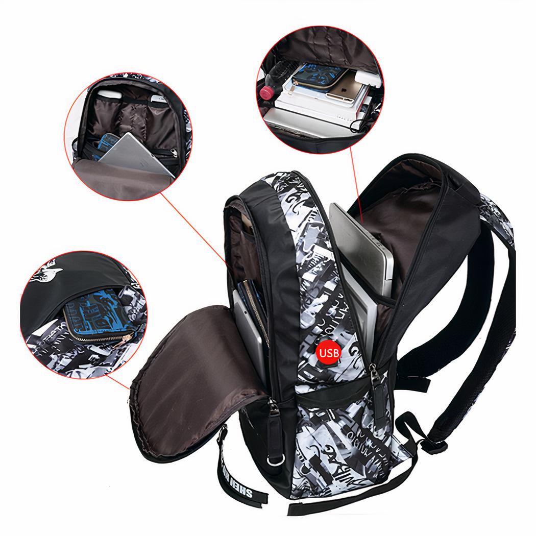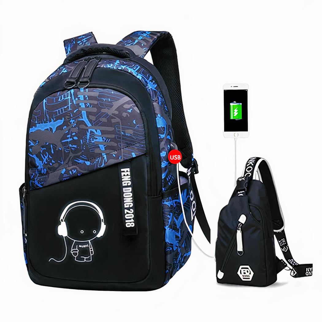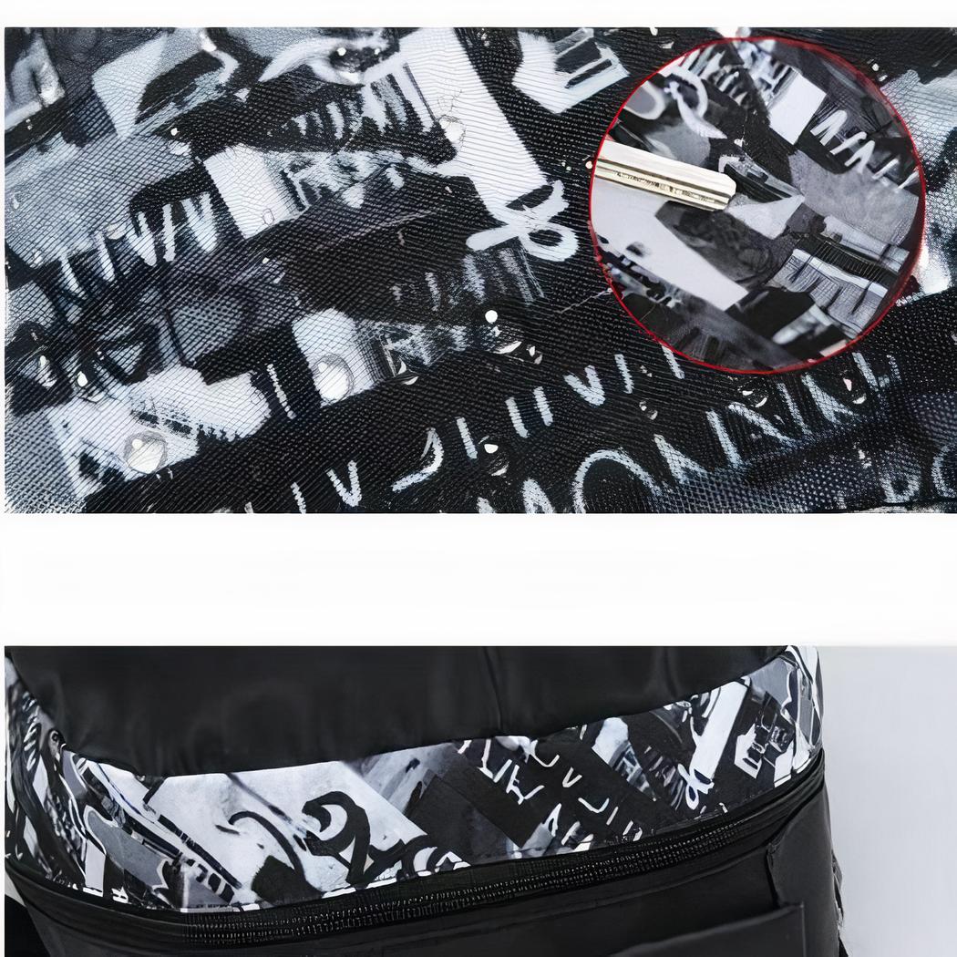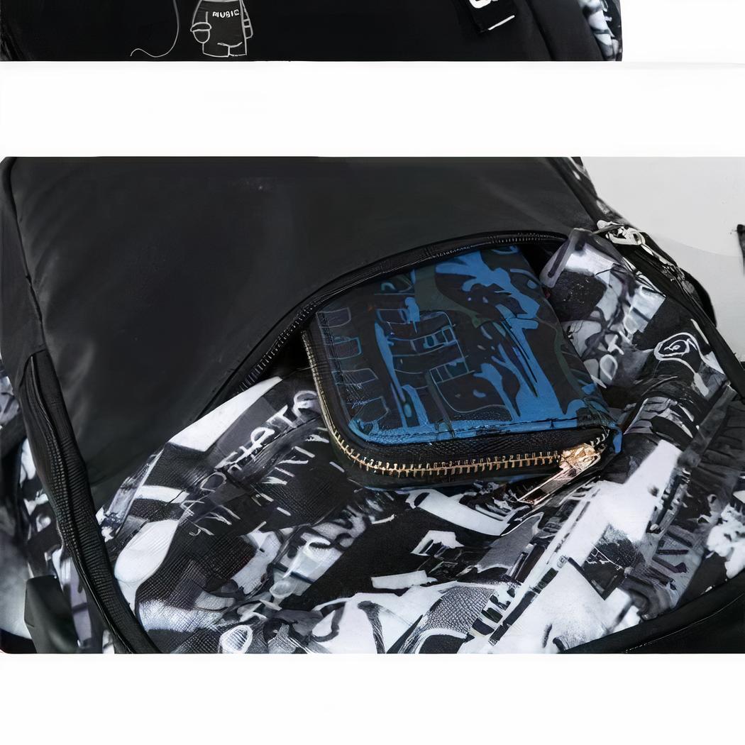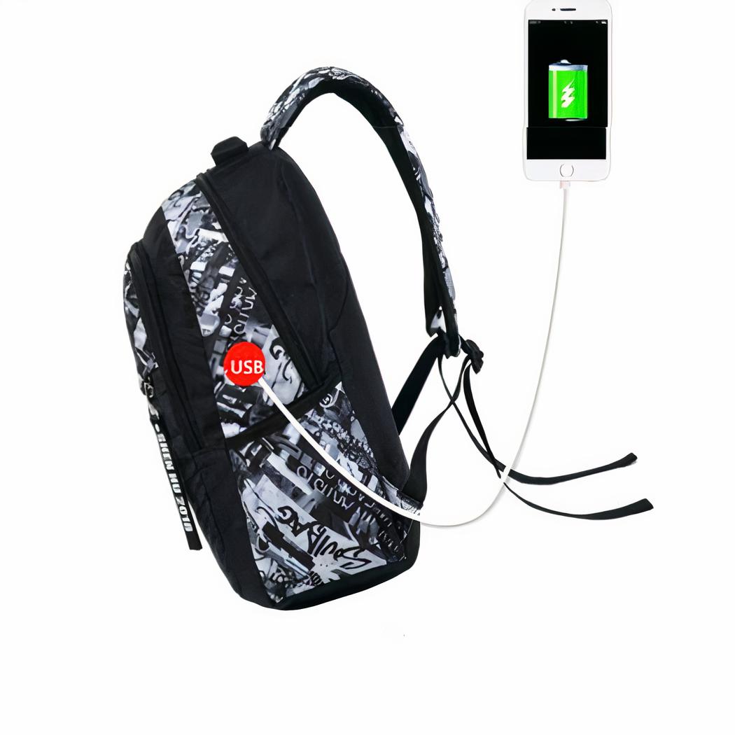 Esta mochila con motivos de graffiti y puerto USB para chicos es perfecta para los chicos jóvenes y modernos. Con su aspecto moderno y sus originales motivos, esta mochila viene con un bolso a juego para un almacenamiento extra. ¡Equipe a su hijo para la vuelta al cole!