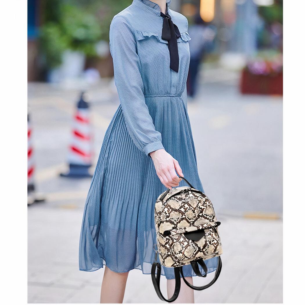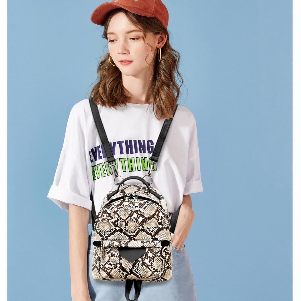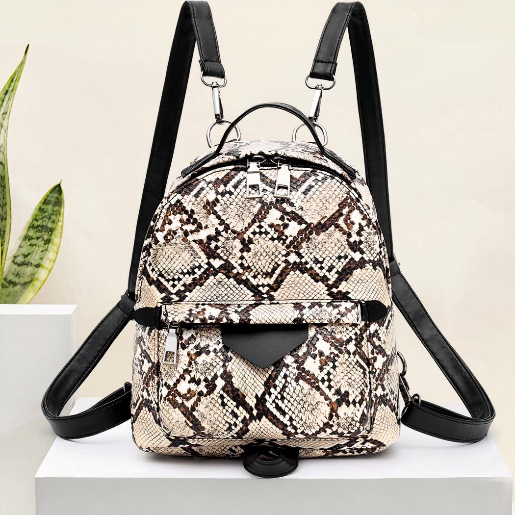 Una pequeña mochila de moda en imitación de piel de serpiente. Este práctico bolsito le permitirá llevar todo lo que necesite para el día. Llévela colgada del hombro o como mochila, seguro que dará el toque final a su estilo.