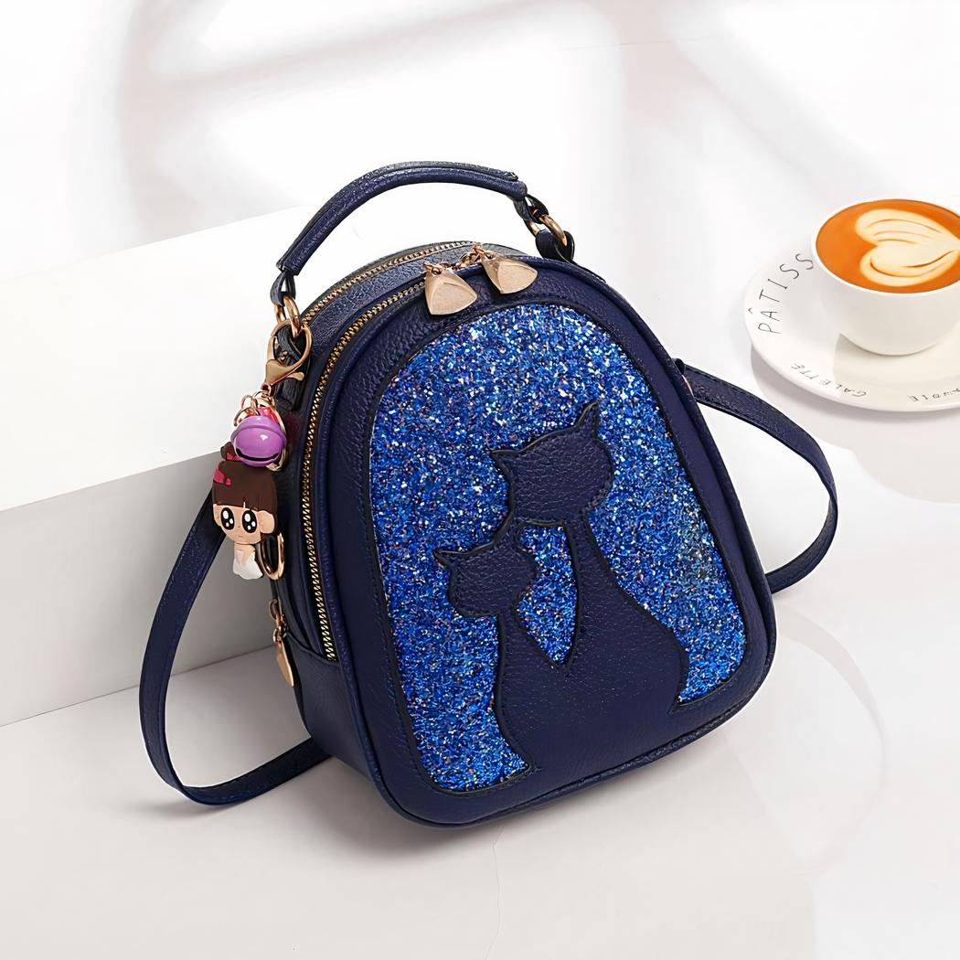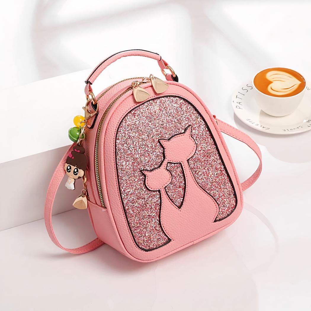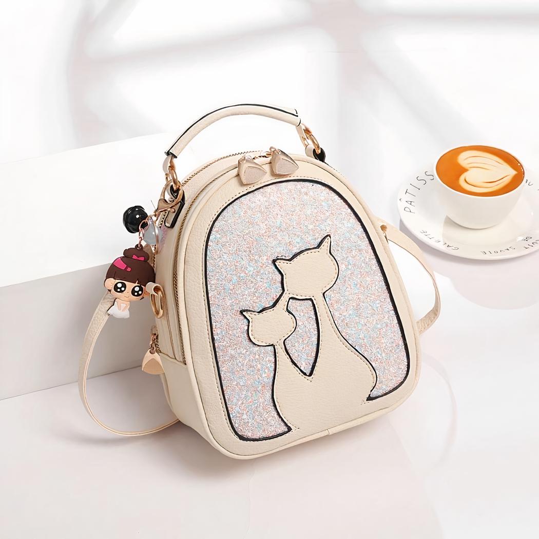 Regálese o regale a su hija esta bonita mochila de lentejuelas en polipiel con motivo de gato. Una bonita mochila con un colgante de niña sujeto a la cremallera. Nuestra mochila está disponible en varios colores para todos los gustos. ¡Le encantará!