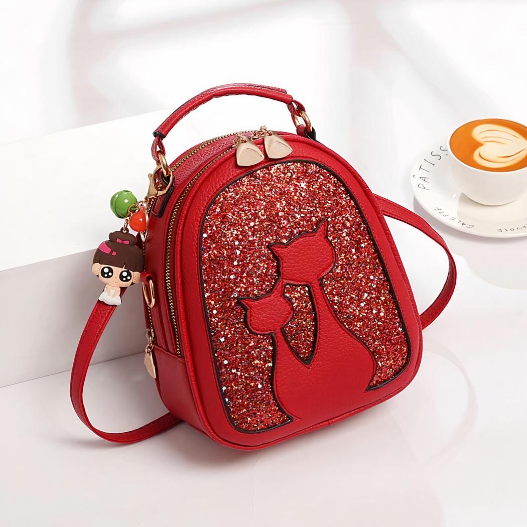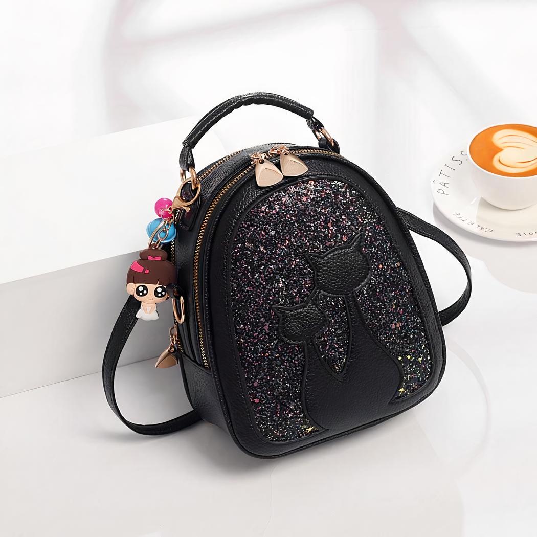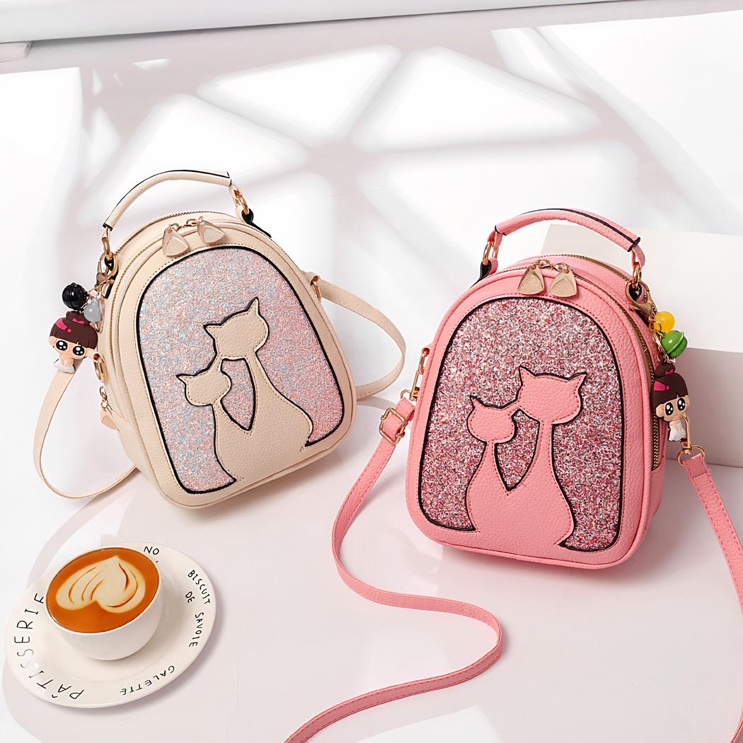 Regálese o regale a su hija esta bonita mochila de lentejuelas en polipiel con motivo de gato. Una bonita mochila con un colgante de niña sujeto a la cremallera. Nuestra mochila está disponible en varios colores para todos los gustos. ¡Le encantará!