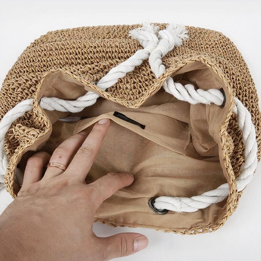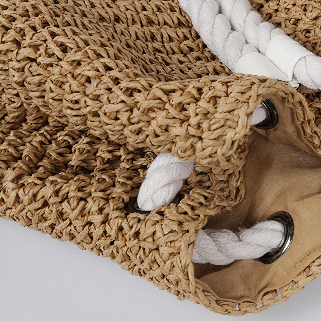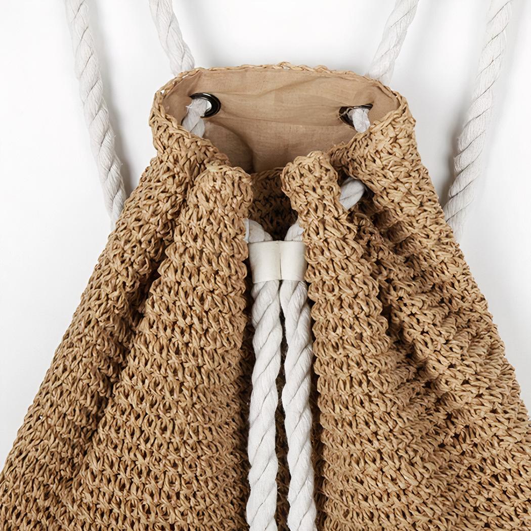 Esta mochila de verano de paja con cordón de punto es un accesorio de moda imprescindible para sus días soleados. Fabricada con paja de alta calidad, esta mochila es resistente y duradera. La textura suave y ligera de la paja le proporciona un tacto agradable.