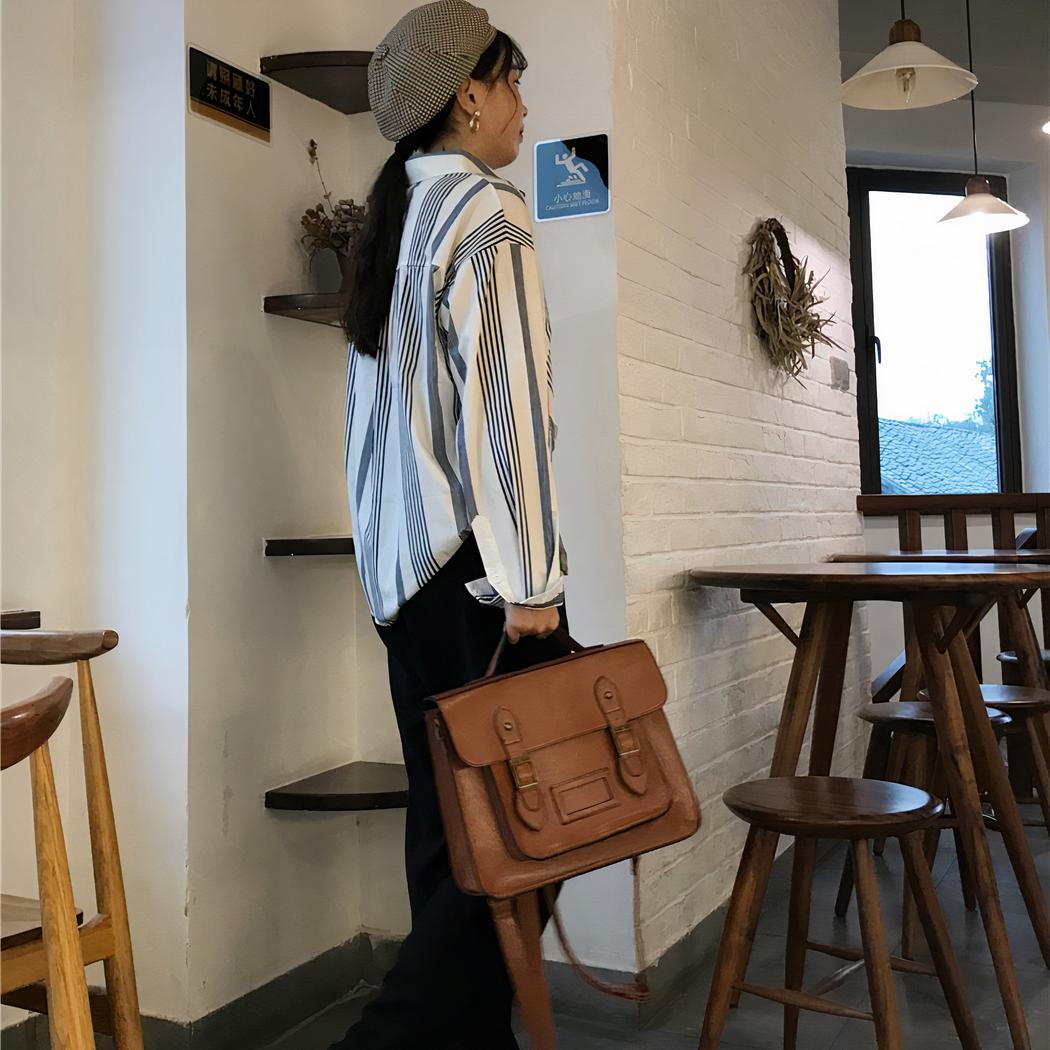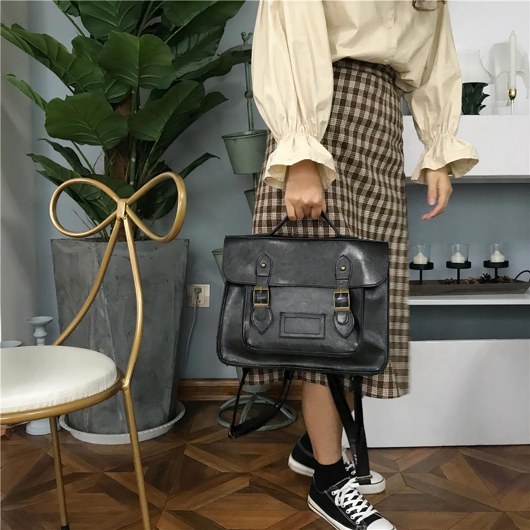 Una magnífica mochila satchel vintage, como las antiguas satchels escolares o los maletines de los hombres de negocios. Este bolso puede llevarse a la espalda, en la mano o como bandolera con su correa desmontable y ajustable.