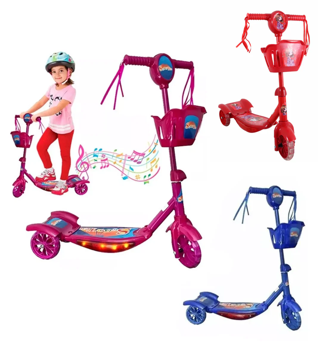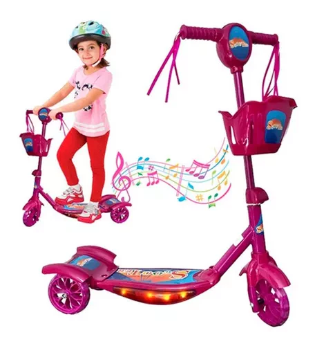 - Patineta scooter para niños y niñas con luces y canasta tres ruedas súper resistentes.