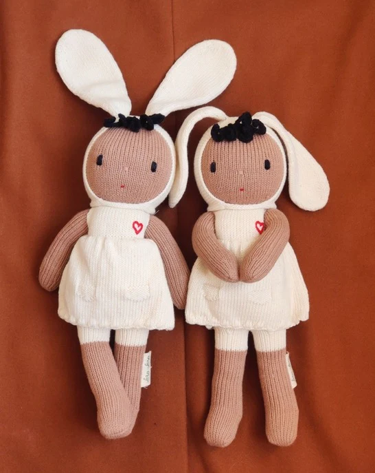 CANELA lleva un divertido gorro con orejas de conejo. Estos rostros sencillos (Waldorf) transmiten una expresión alegre que estimula la imaginación y el juego creativo. La alegría, la tristeza y cualquier otra emoción se pueden trasladar a la muñeca. Hechos a mano con materiales 100% naturales, tienen un cuerpo suave y afelpado. ¡Suficiente para hacerte querer abrazarlos!