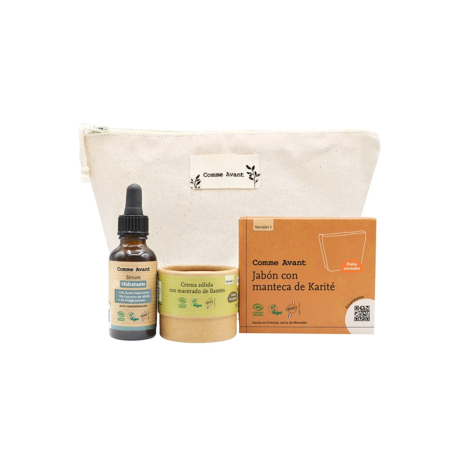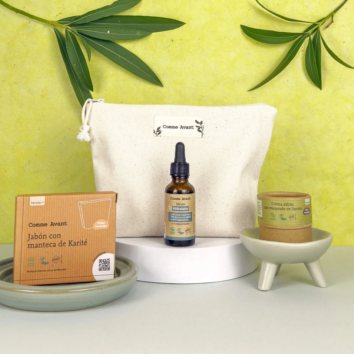 Descubra tres productos 100 % naturales para completar su rutina diaria de cuidado de la piel: un jabón de manteca de karité, un sérum hidratante y una crema con macerado de llantén.