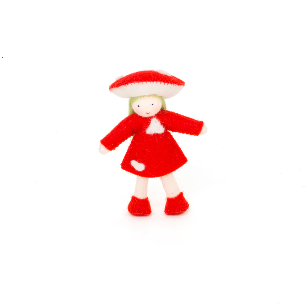 Delicada muñequita de fieltro y algodón seta realizada en fieltro. Con brazos y piernas articulados para la mesa de estación. Tiene un bonito y sencillo vestido rojo con motivos blancos monísimo.