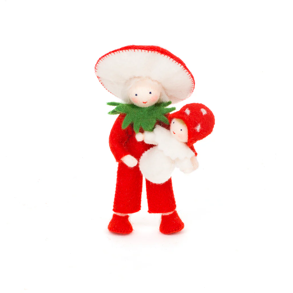 Delicado padre seta realizada en fieltro. Con brazos y piernas articulados para la mesa de estación. Tiene un bonito y sencillo traje rojo.