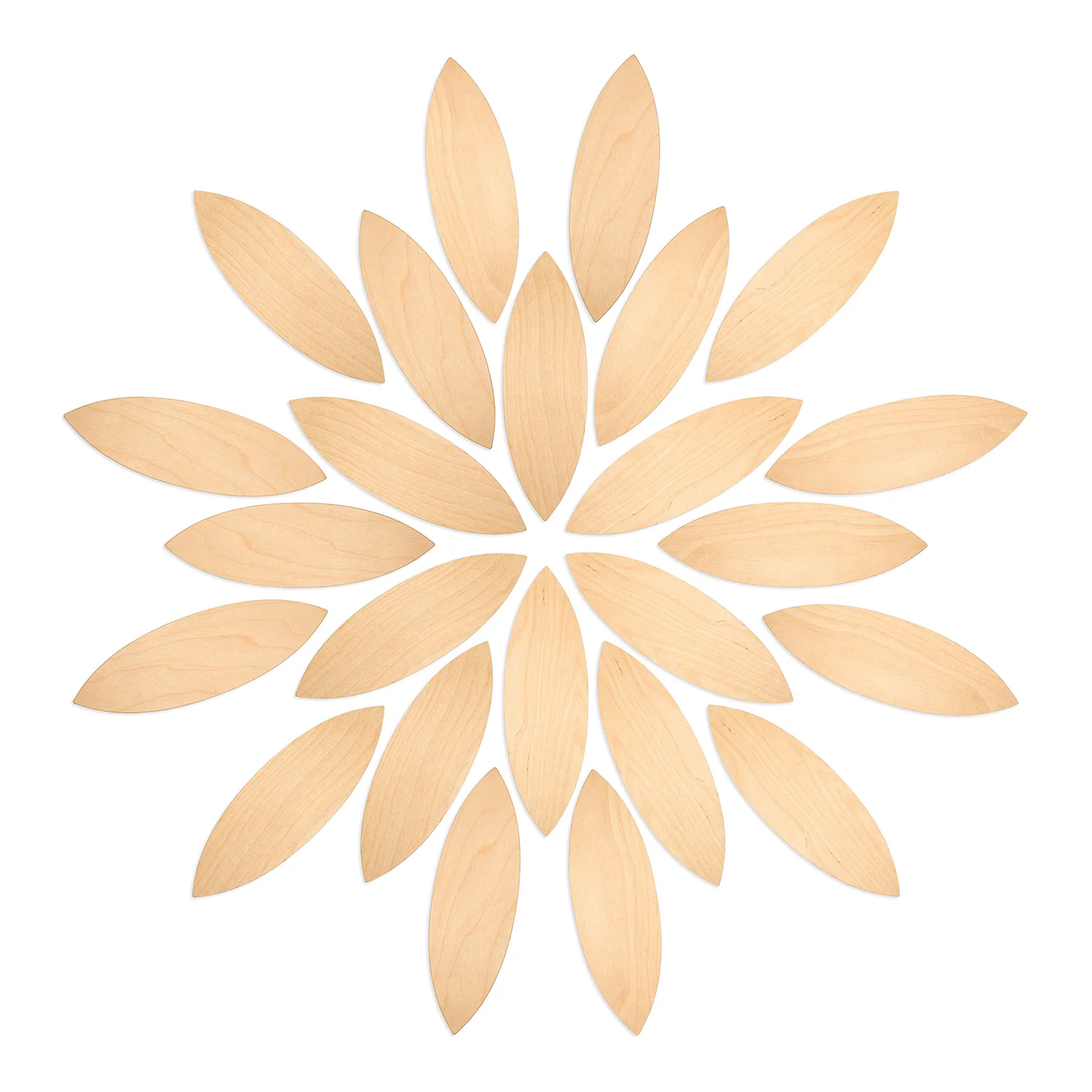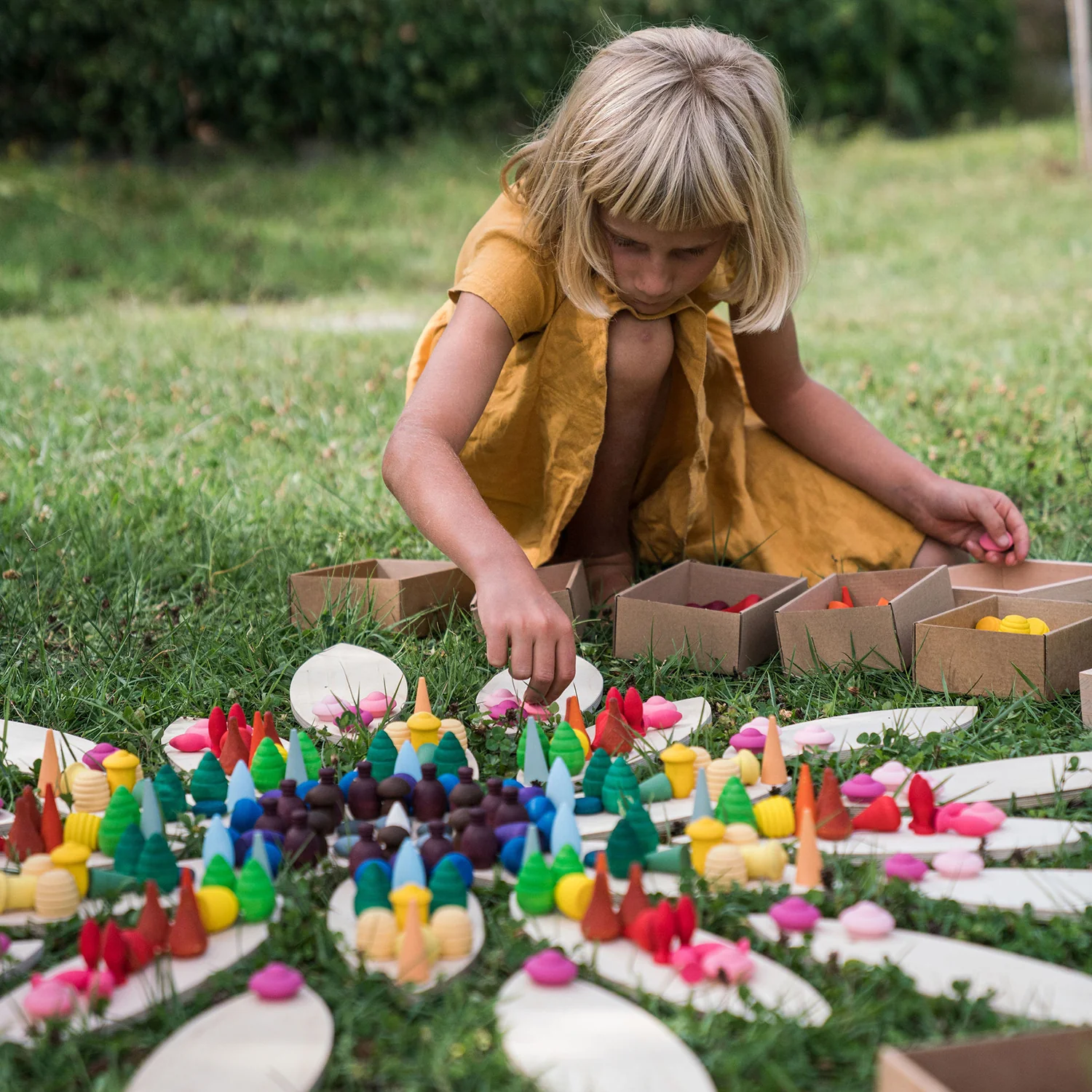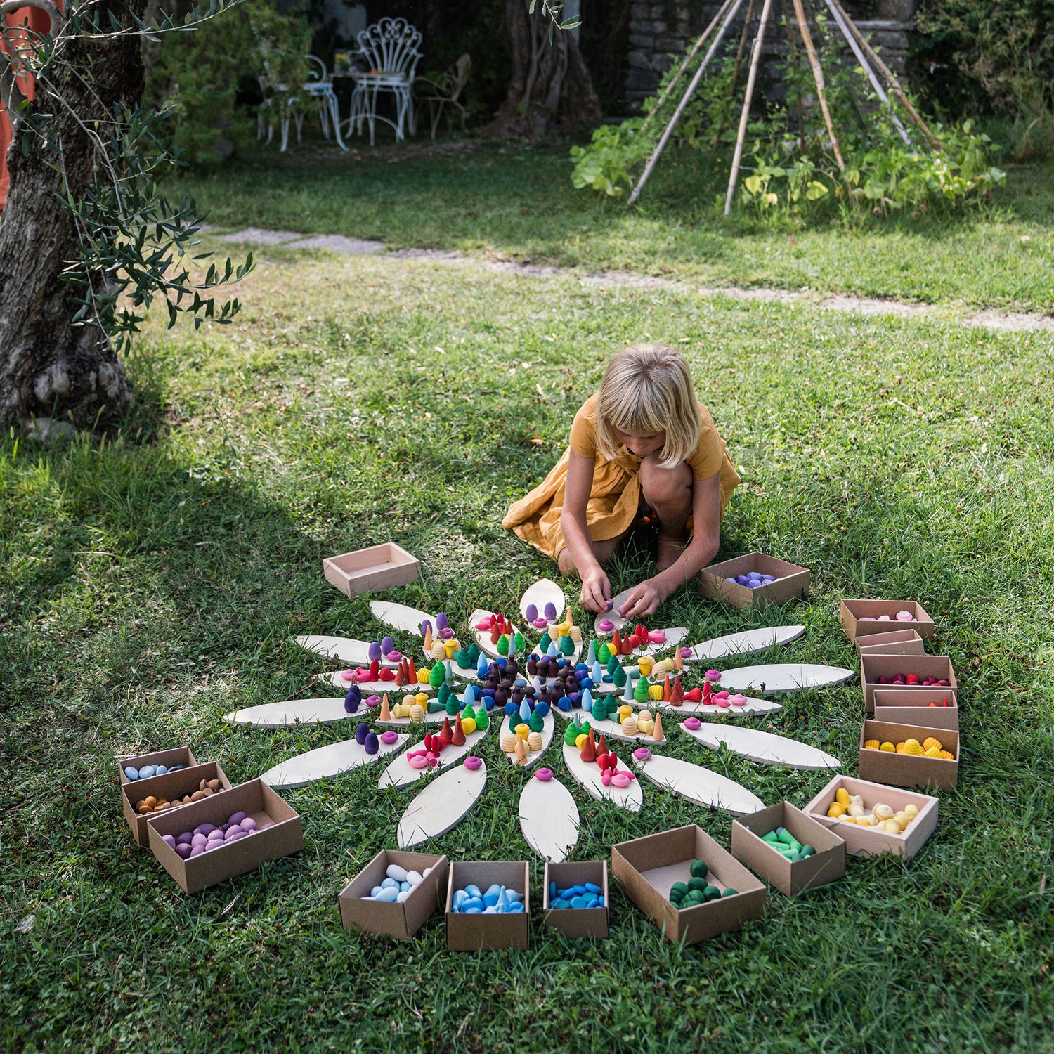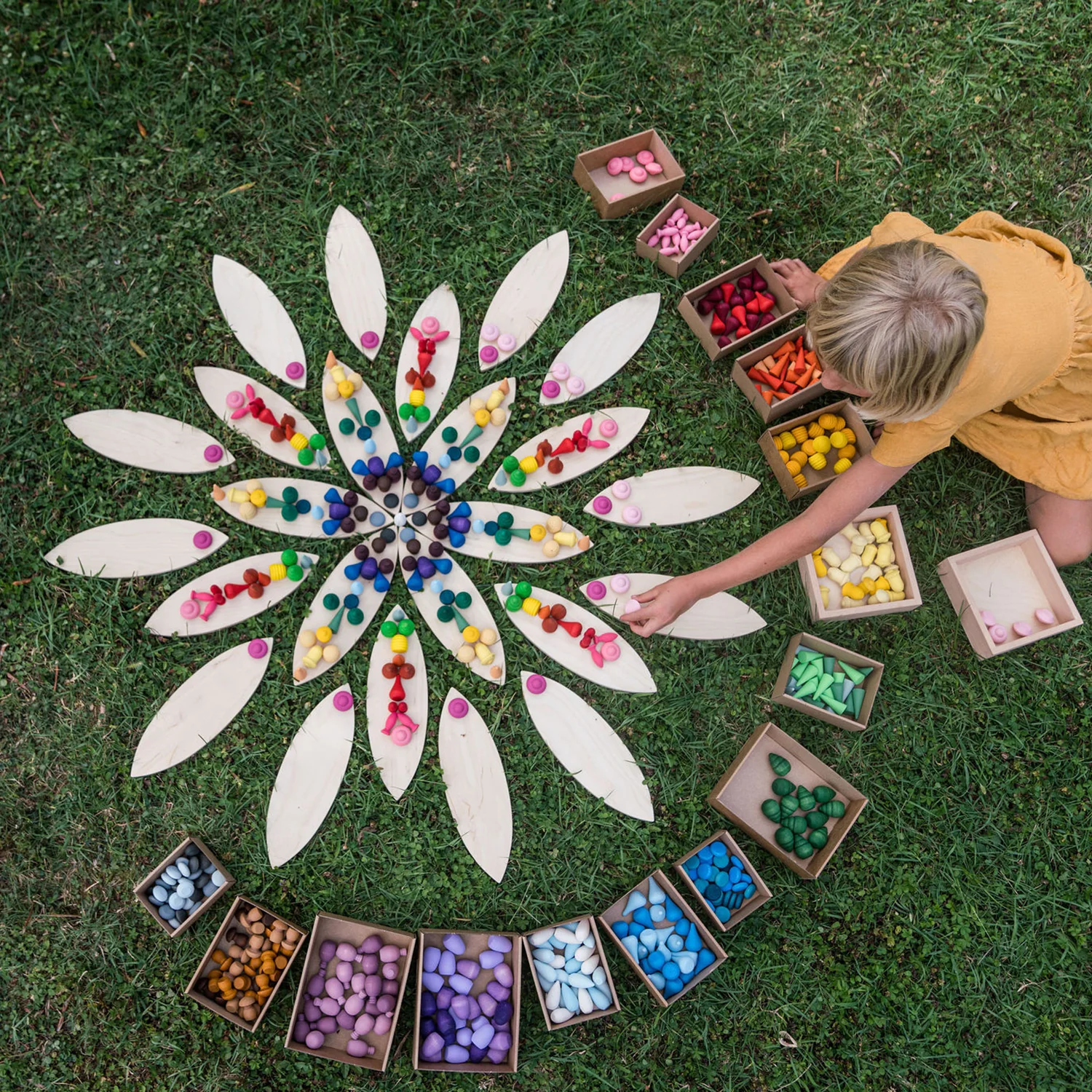 Está formada por 24 piezas planas de madera contrachapada en forma de pétalos de flor. Es un estupendo material no estructurado para cualquier actividad de juego abierto. Se pueden utilizar como plataformas para juegos de construcción libre y mandalas.