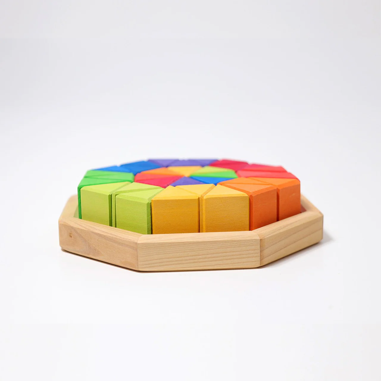 Puzzle de 32 bloques de colores triangulares en base de madera con forma de octógono. Hasta los niños más pequeños pueden explorar las formas geométricas cuando construyen con estos triángulos. Estupendo para trabajar la coordinación y la motricidad fina.